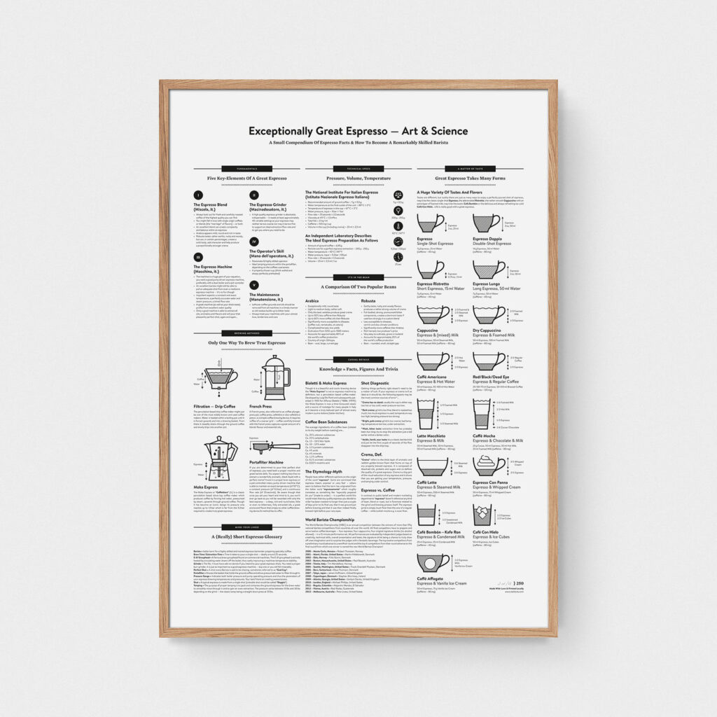 Exceptionally Great Espresso is a large one-colour silkscreen print and a compact, yet profoundly detailed reference guide. While pulling a great shot of espresso is both an art form and a science this guide from Stellavie will teach you to become a skilled barista yourself. Printed with a beautiful Italian paper stock — how could it be printed on anything else?