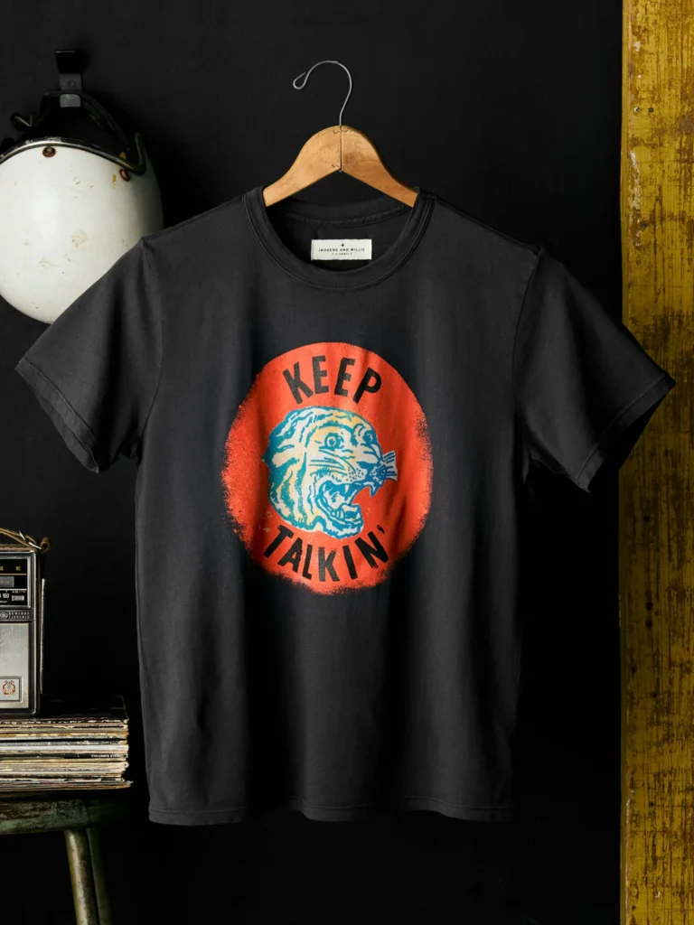 Born in Nashville and bred from a deep appreciation for vintage wear, this Keep Talkin’ Tee was developed entirely in-house. It starts with original hand-drawn artwork, channeling the spirit of thousands of vintage tees the team has collected and studied over the years. Each piece is then screenprinted locally, ensuring the final product carries the same authentic soul as the inspiration behind it.