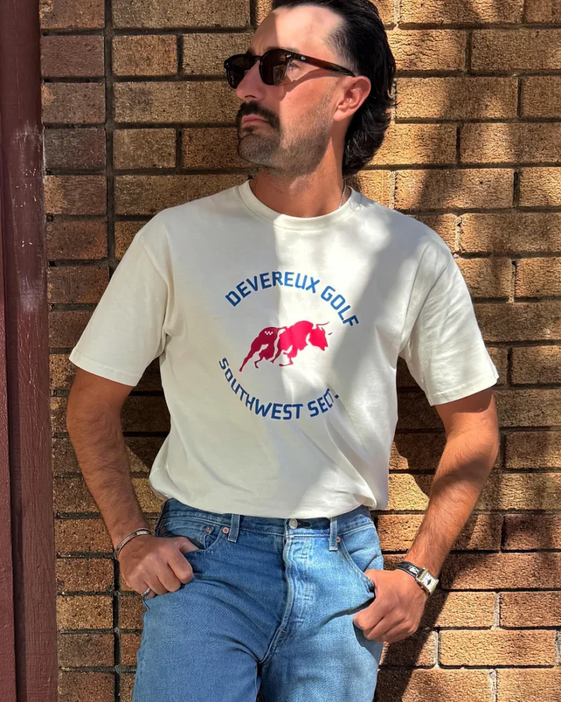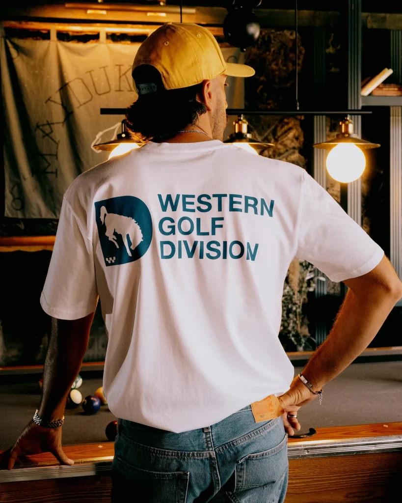 The Western Golf Division Tee celebrates Devereux’s roots in the great Southwest, a nod to the golfers who travel desert highways and mountain passes chasing tee times and sunsets. Western-inspired typography and vintage artwork bring old-soul charm to modern golf style.