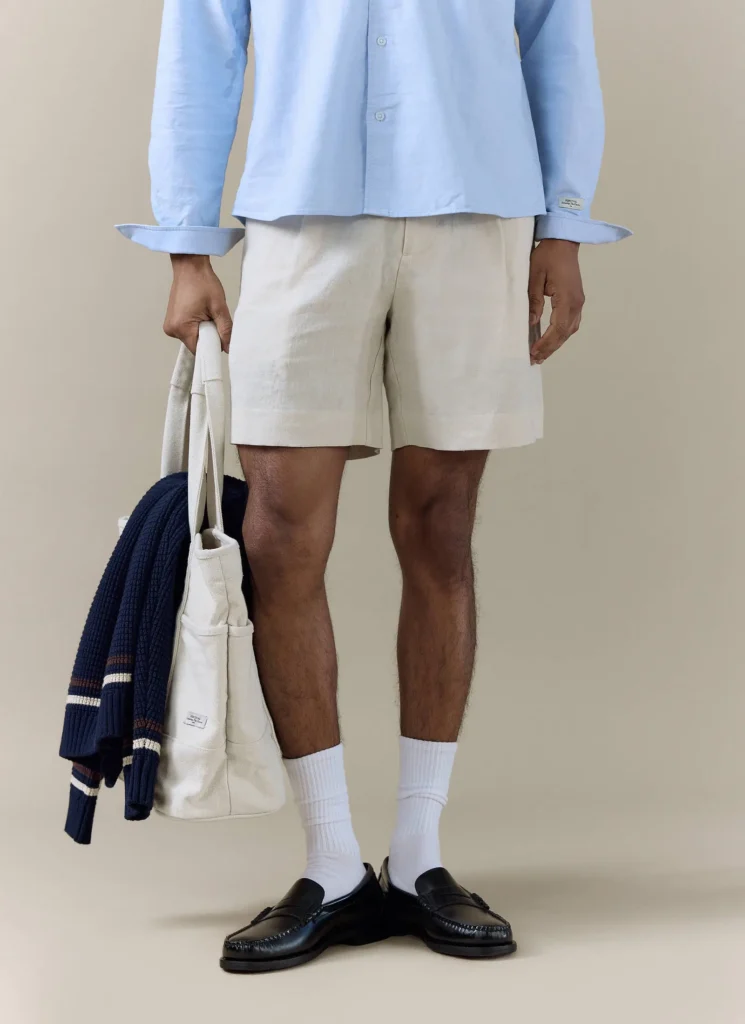 Linen done properly. Percival’s Pleated Tailored Shorts are cut from breathable 100% linen in a clean cream, with a neat front pleat and a sharp, just-above-the-knee length. Smart enough for summer events, easy enough for everyday. Tidy.