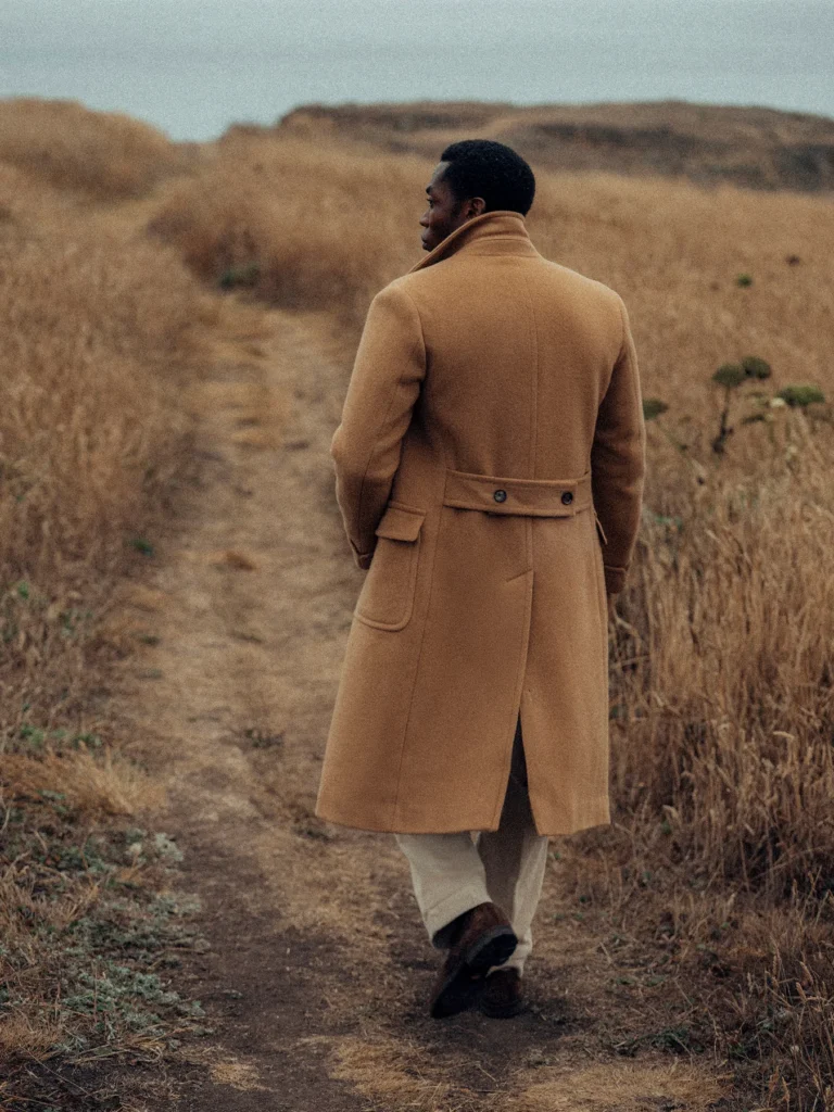 A classic double-breasted polo coat, cut from Italian-milled wool and fully canvassed for structure and drape. It carries a chest welt pocket, hip patch pockets with flaps, a single center-back vent with hidden button closure, and a belted back with button fastening. The interior is lined in viscose with two welt pockets and a patch pocket, while robe sleeve cuffs and horn buttons complete the construction.