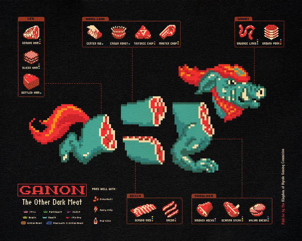 Ever wondered what your favourite Nintendo characters taste like? Well, no, me neither really but it definitely makes for an interesting design piece to have the best parts of their anatomy slapped onto these butcher style diagrams. The brainchild of American designer, Jude Buffum, of Philadelphia, these wonderfully conceived pieces will make it much easier for you to know what to toss on the barbecue if you happen across Yoshi, Chocobo or Koopa on your next camping expedition. Check them out below: