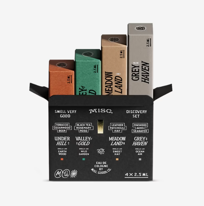 A cologne discovery set to explore some of Misc. Goods Co.’s favorite places. Their quest to create these fragrances took years of work but has resulted in four complex, earthy scents that capture natural smells from the woods to rolling hills. This sampler set is designed to help you find your perfect scent match for each season.