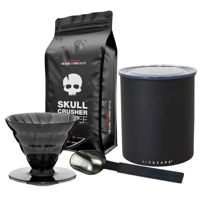 Take your coffee game to the next level with our Skull Crusher Coffee, Airscape Canister, Black Metal Coffee Scoop, and V60 Hario Dripper Bundle. Start with our bold, high-caffeine Skull Crusher Coffee, expertly crafted to deliver a rich, full-bodied brew. Keep your coffee fresh with the Airscape Canister, designed to lock out air and preserve flavor. Measure with precision using the Black Metal Coffee Scoop, and brew like a pro with the V60 Hario Dripper and filter papers for a clean, flavorful cup every time.