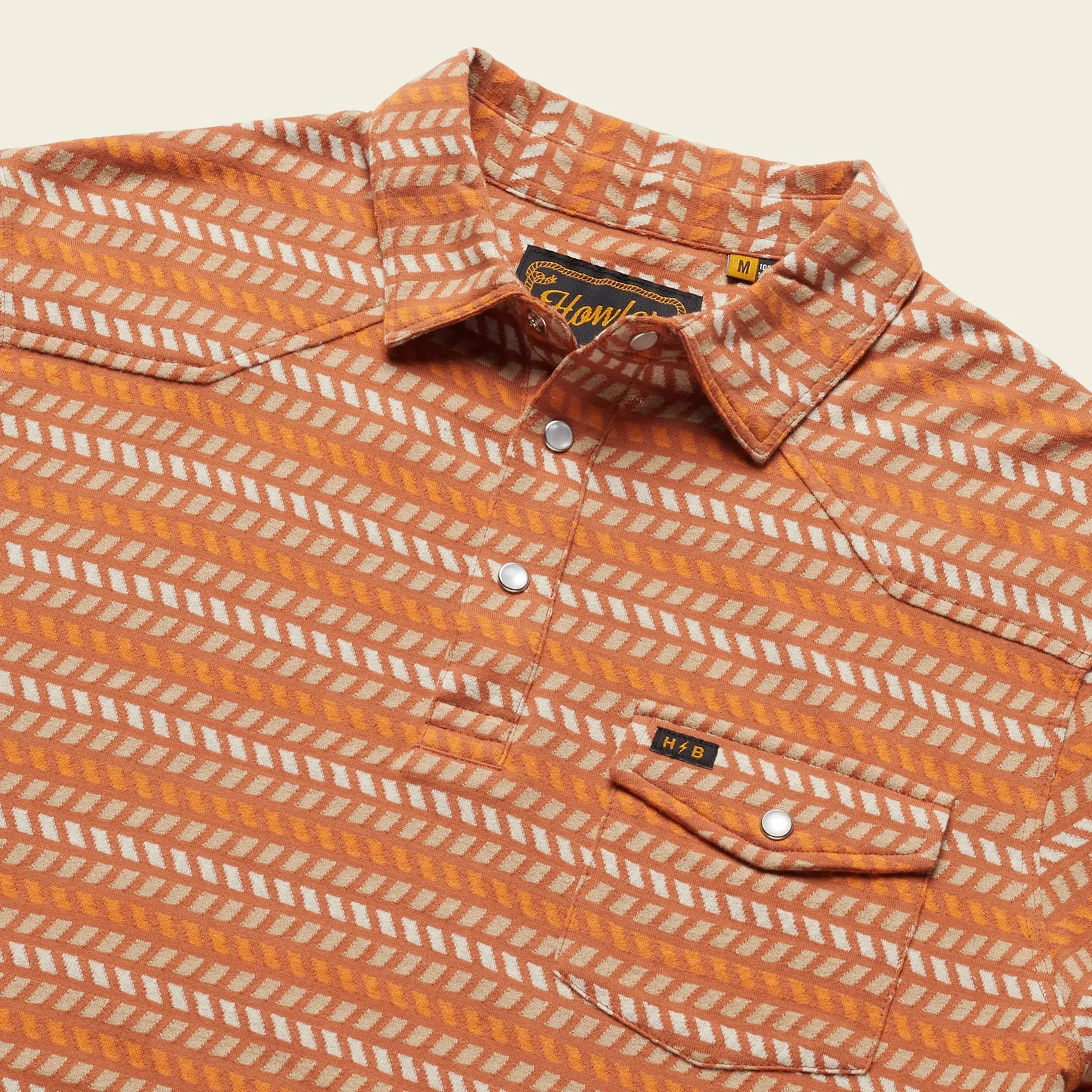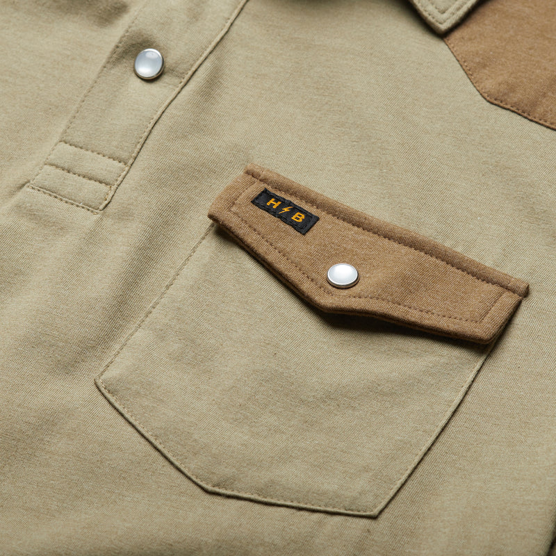The Ranchero Jacquard Polo combines the pearl snap western essence of our Ranchero Polo with the vintage look of HB’s popular jacquard tees and tanks. Made of super soft 100% cotton jacquard with a single snap pocket and straight hem for untucked wear.