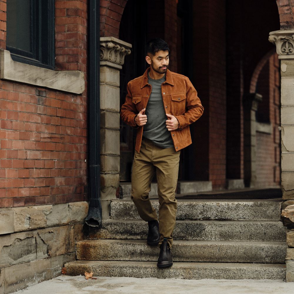 • Timeless trucker silhouette cut from a butter-soft cow suede