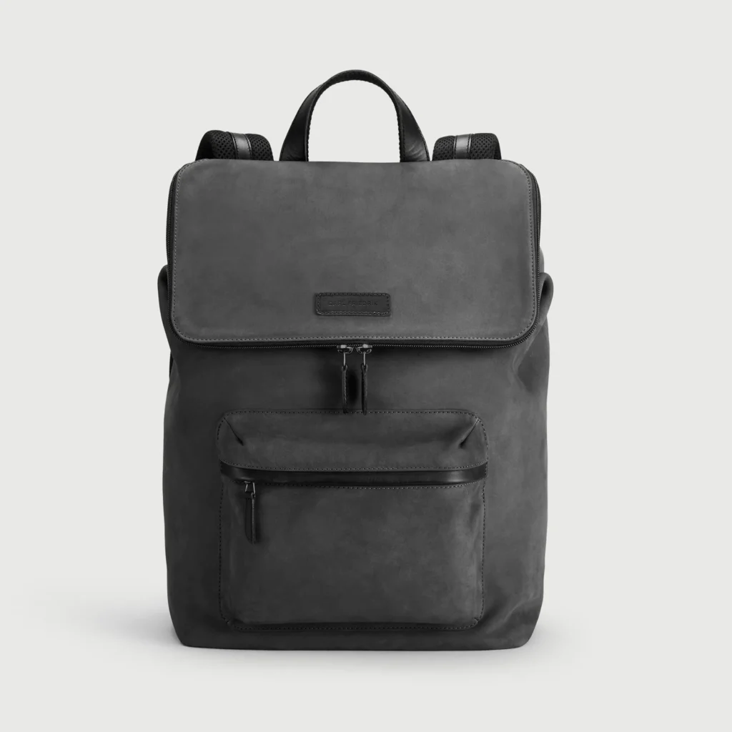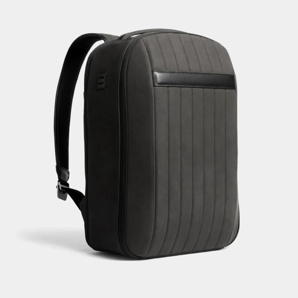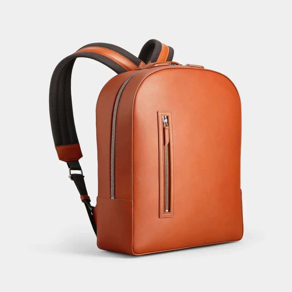 The shoulder straps boast refined leather detailing and padded mesh to enhance comfort. The leather front has a vertical zip pocket for EDC essentials. Inside, the backpack contains a zip pocket, two fabric pockets and two pen holders.