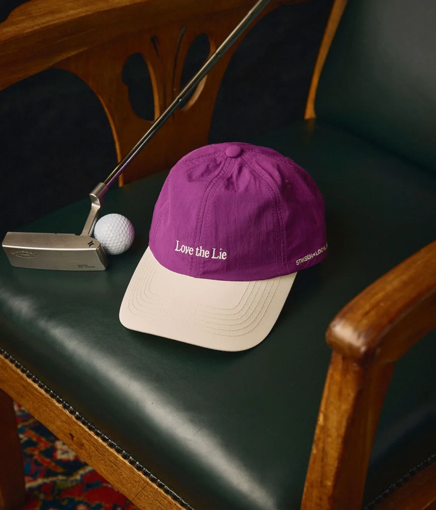 The 105 Stiksen x Local Rule Love the Lie is a limited edition, unstructured dad cap created in collaboration with the Swedish golf brand Local Rule. This multi-color cap features a purple crown and an off-white brim, crafted from high-density, water-repellent technical Italian nylon fabric. It offers a cotton-like feel and a stylish crinkled look.
