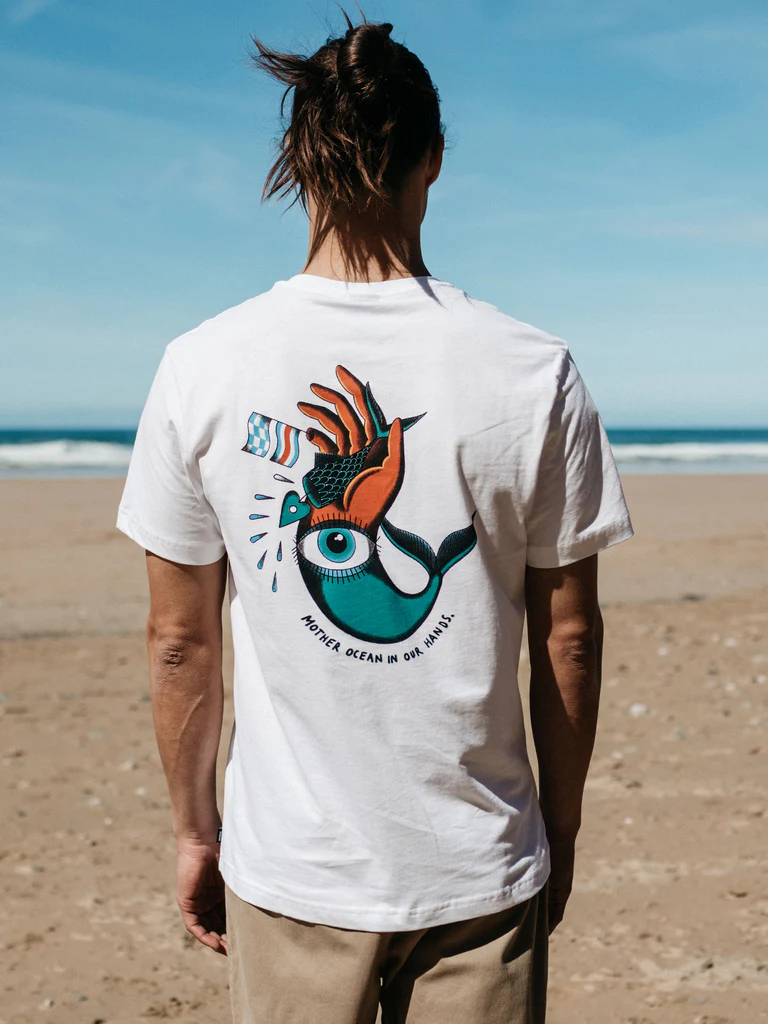 Finisterre’s latest heavy-weight t-shirt, crafted from a new blend of organic and recycled cotton, embodies durability and style. The regular fit JV Fish Tee features distinctive artwork by Josh, screen printed on the back. The front showcases Finisterre branding in a custom font, making this t-shirt both unique and versatile.