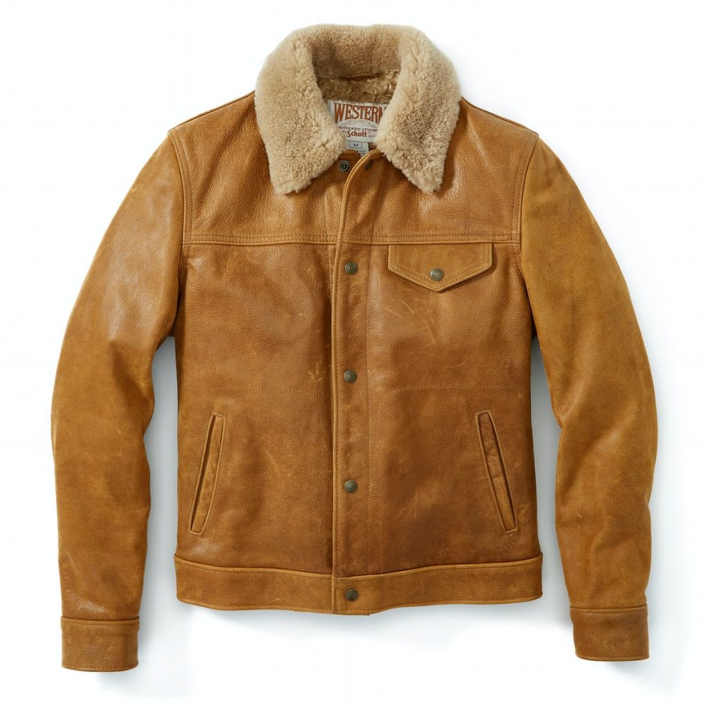 Schott Men’s Waxy Vintage Buffalo Trucker Jacket with Sheepskin Collar – $845