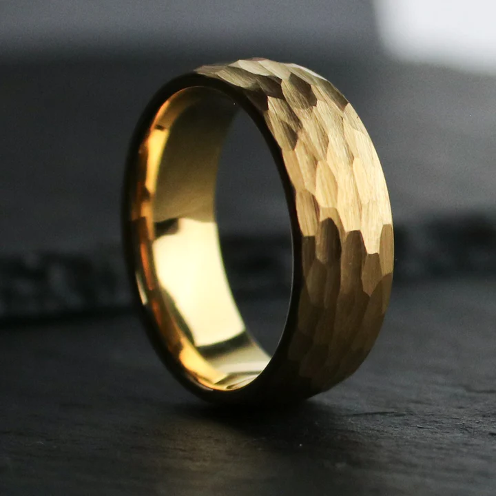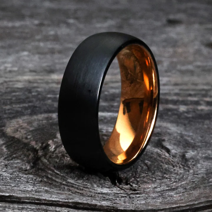 Hammered black Tungsten Carbide pairs with a Rose Gold interior and offset inlay in the contemporary, understated wedding band. The ring is forged via sintering in an industrial mould and it is PVD coated, meaning it has gold titanium plating ionized on it in a vacuum. This is THE most hard-wearing finish available.