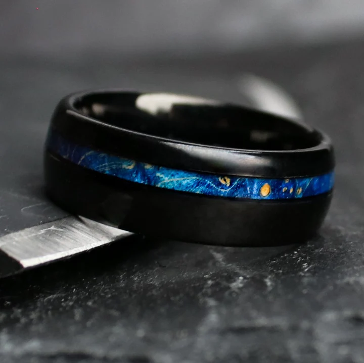 Buckeye burl is one of the most problematic to work and rare species of timber in the world the end result is always worth it. For the Starry Night Ring, Thorum paired this Buckeye Burl with some semi-matte black Tungsten Carbide for a wedding ring of considerable astrological awesomeness.