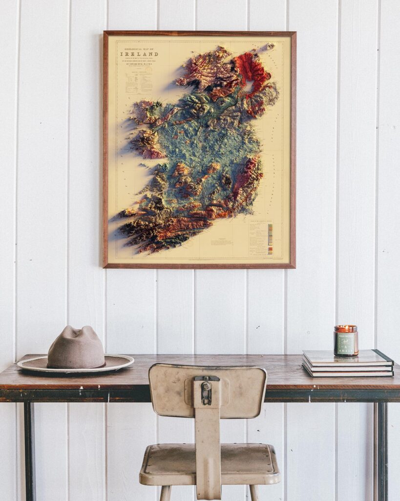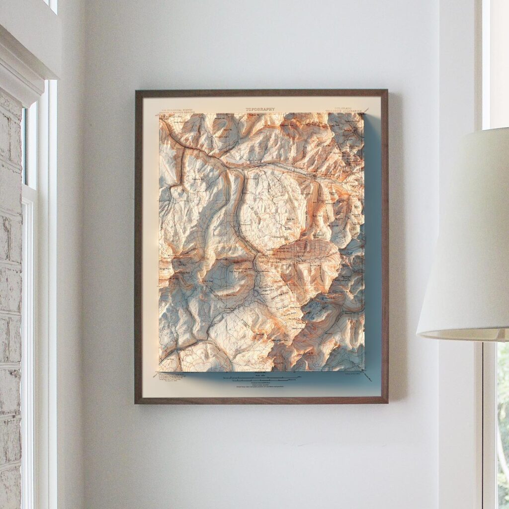 Muir Way created this map with the illusion of 3D by applying Digital Elevation Data and meticulously adding shaded relief to the landscape of the original 1904 Telluride, CO map. The shading is printed on paper and not a result of the map protruding from the surface.