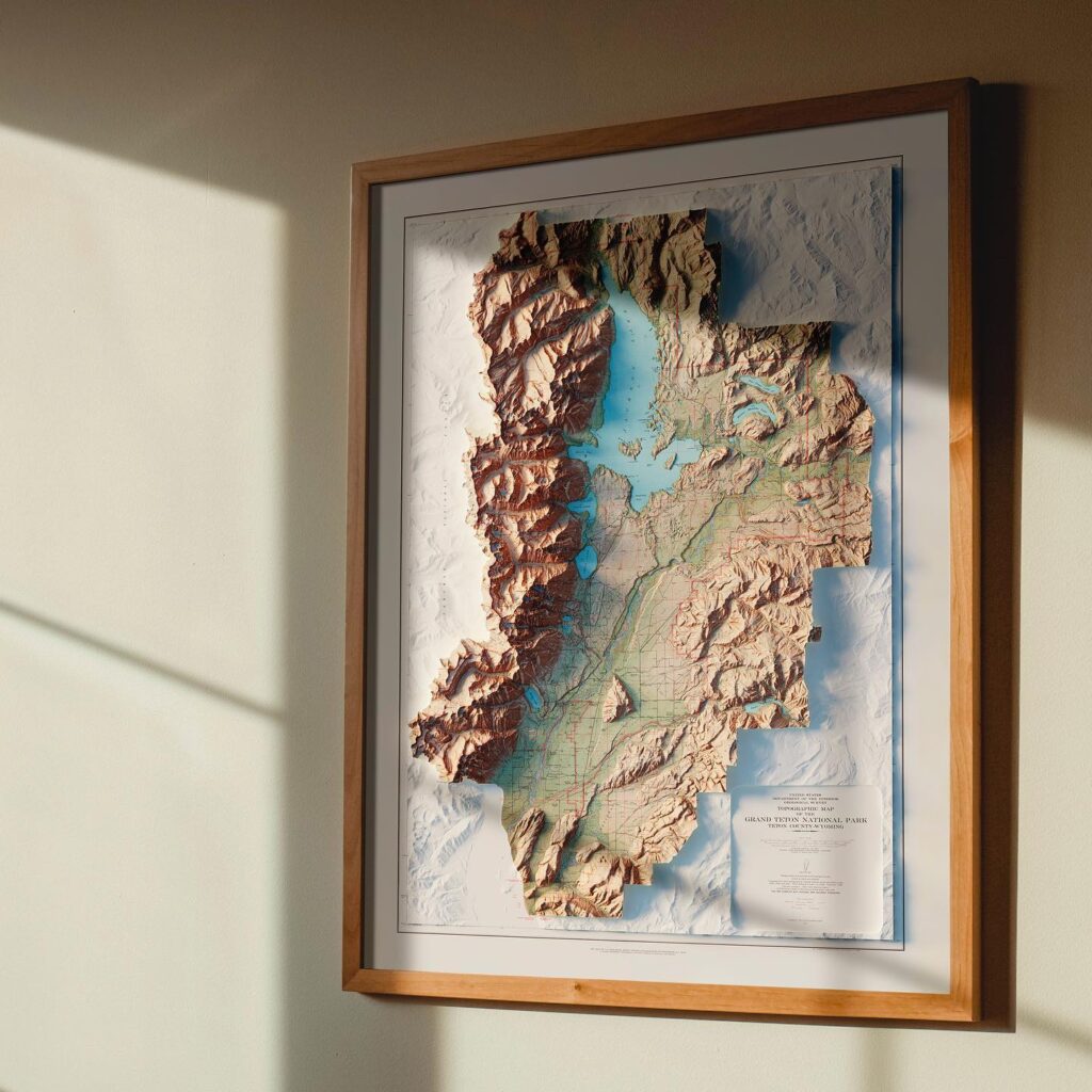 Muir Way created this map with the illusion of 3D by applying Digital Elevation Data and meticulously adding shaded relief to the landscape of the original 1965 Grand Teton National Park map. The shading is printed on the paper and not a result of the map protruding from the surface.