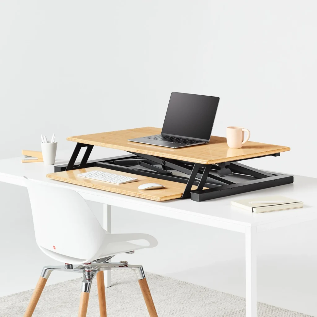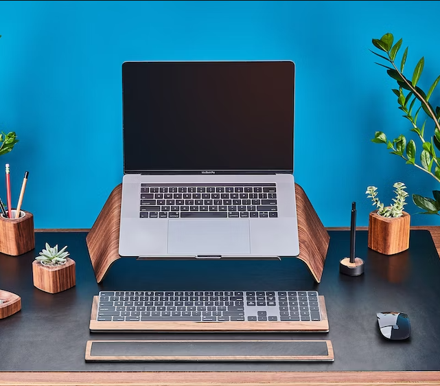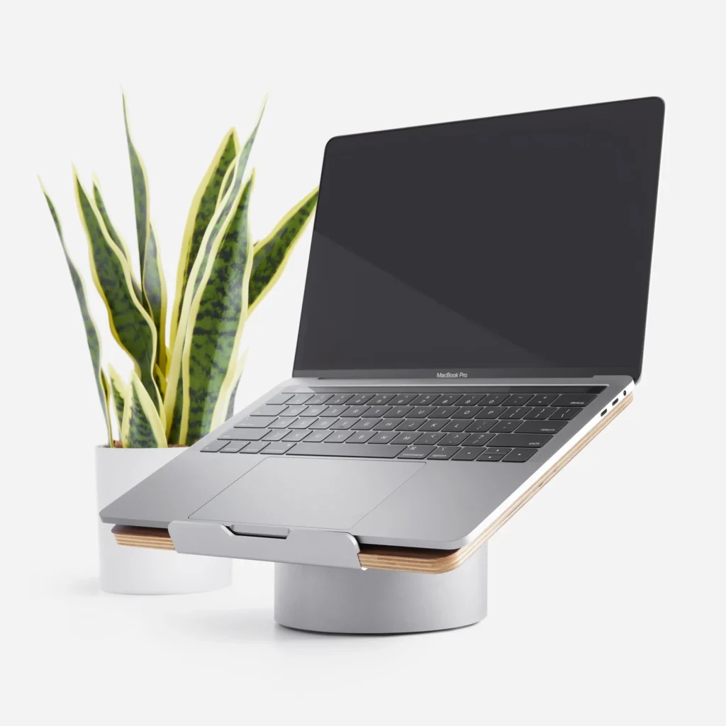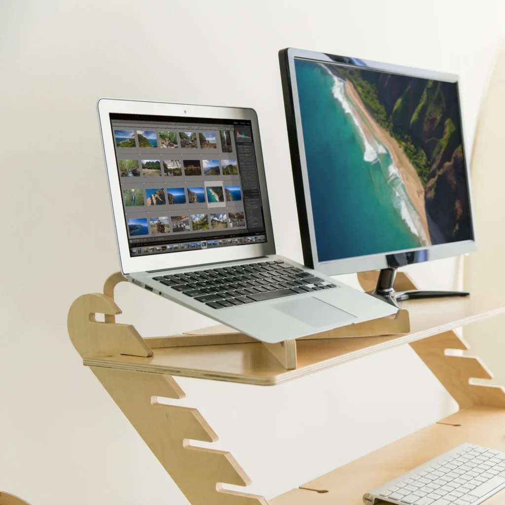 The Readyriser wooden laptop riser has a clean, sweeping aesthetic that gives a much-needed lift to low-slung laptop screens. Angled for ergonomics, this laptop stand provides your laptop with four inches to help you with neck pain and stress from looking down at your screen.