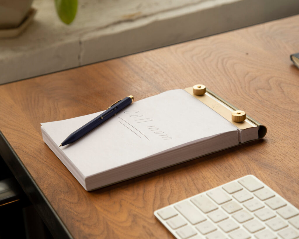 When it comes to taking notes and list making, the Craighill Desk Pad is a cut above the competition. Crafted in a storied Parisian workshop, a sturdy metal frame with rubber feet anchors a perforated writing pad, ideal for neatly tearing out pages on the fly. The pad is affixed to the frame with two handsomely textured brass nuts, and packs of refill pads are available in dot grid or blank paper varieties.