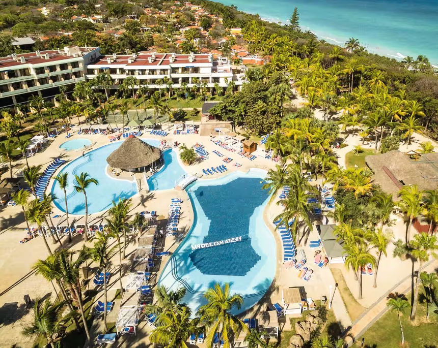 Situated along Varadero’s sandy shores, this hotel offers direct access to a stretch of beach just steps away. Guests can relax beneath a thatched umbrella on the sand or choose a cozy spot beside one of the hotel’s pools.