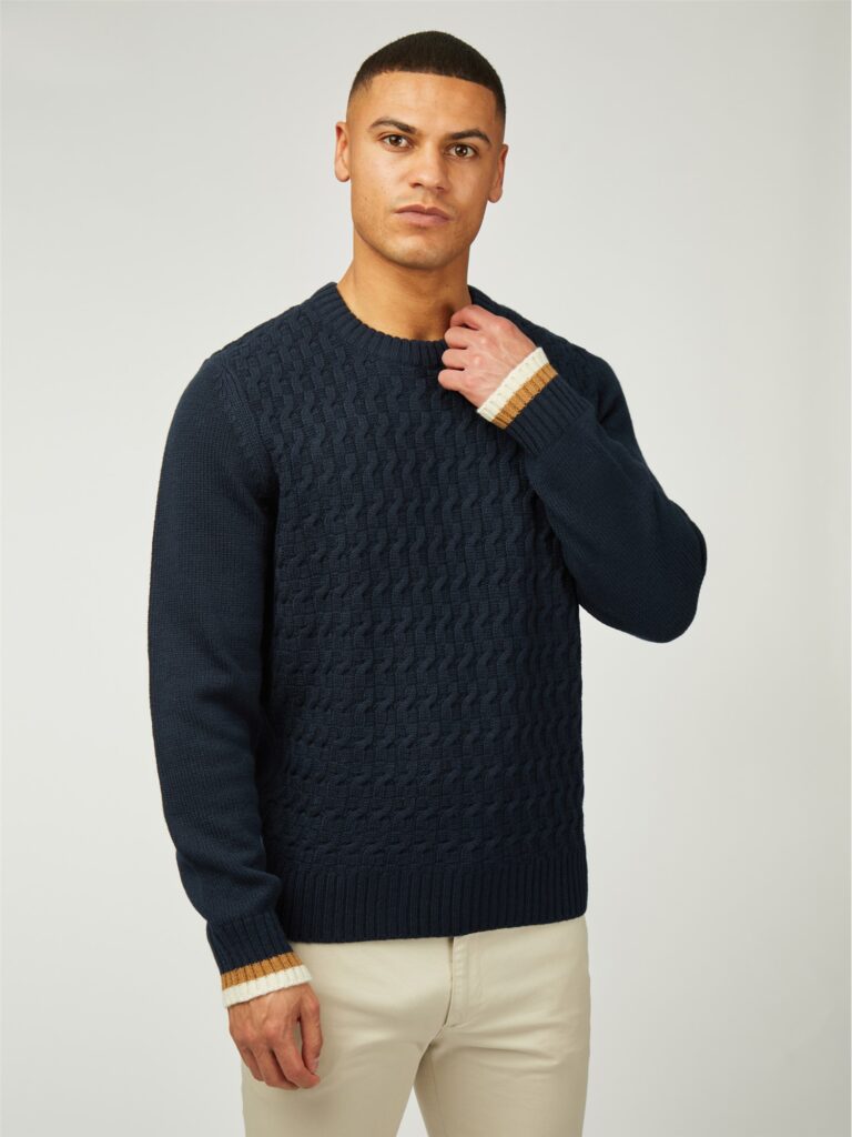 This knitted cable stripe crew features a Ben Sherman™ branded woven label at the side seam. A regular fit, made from a wool blend.