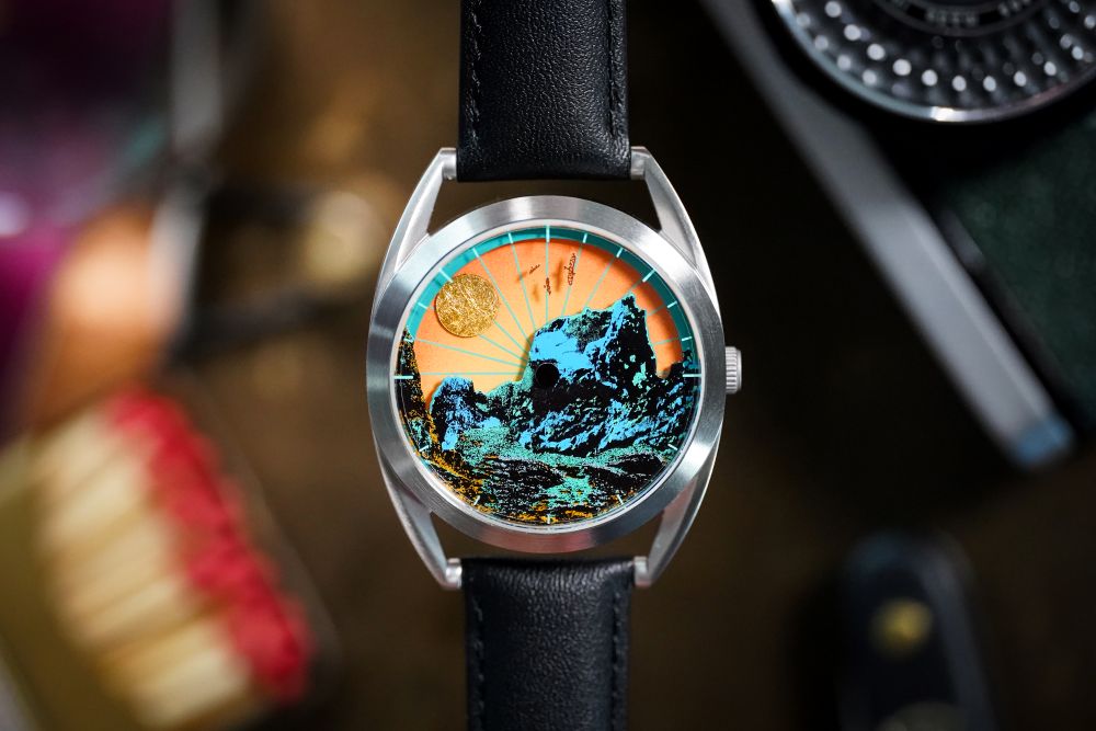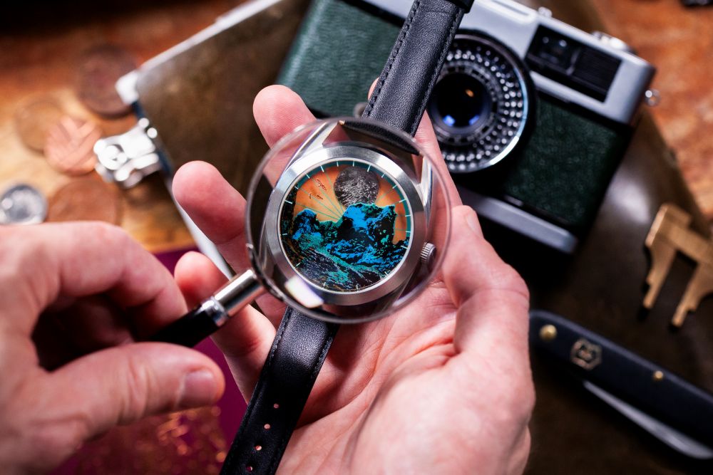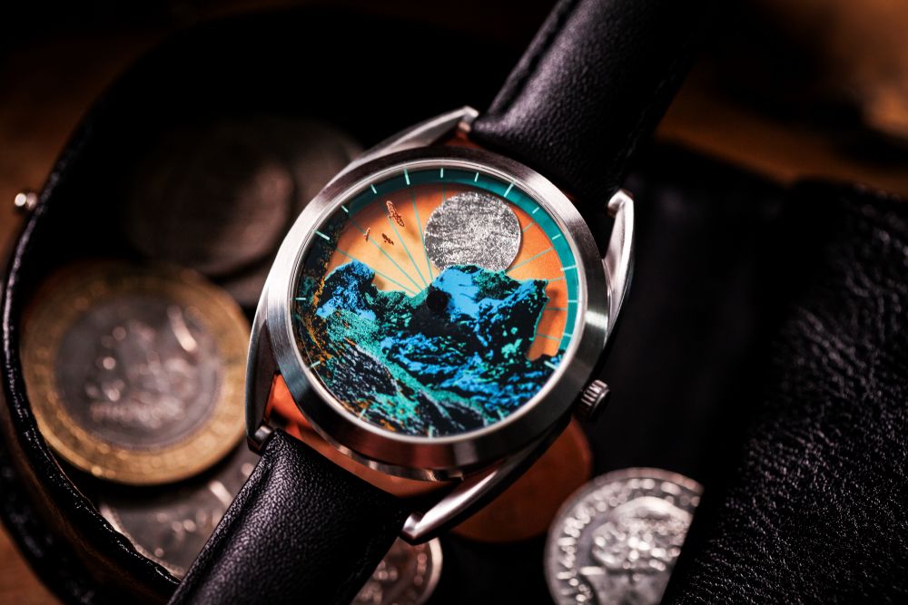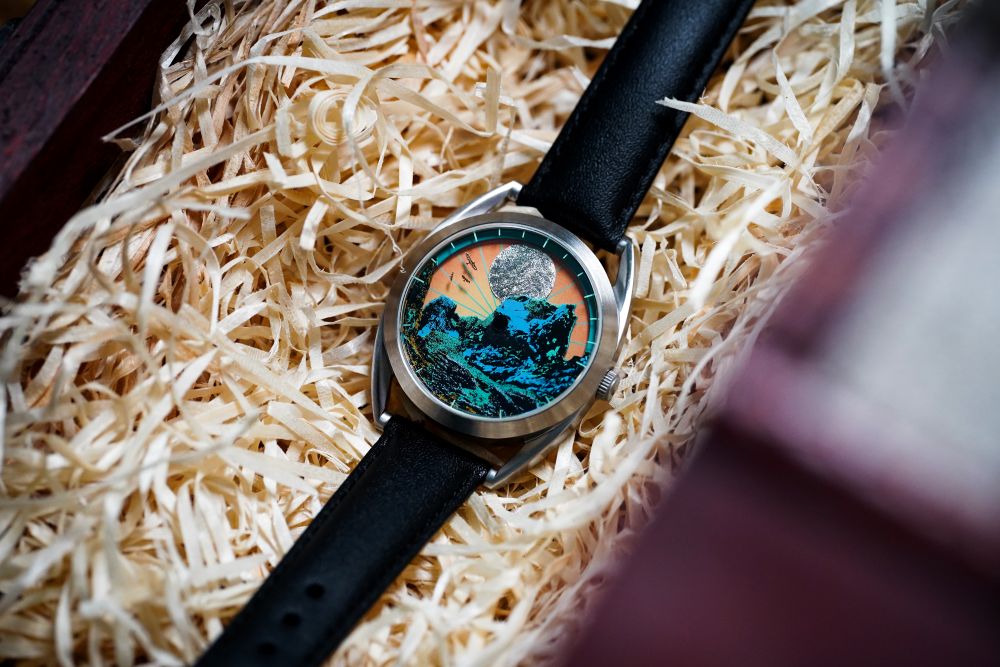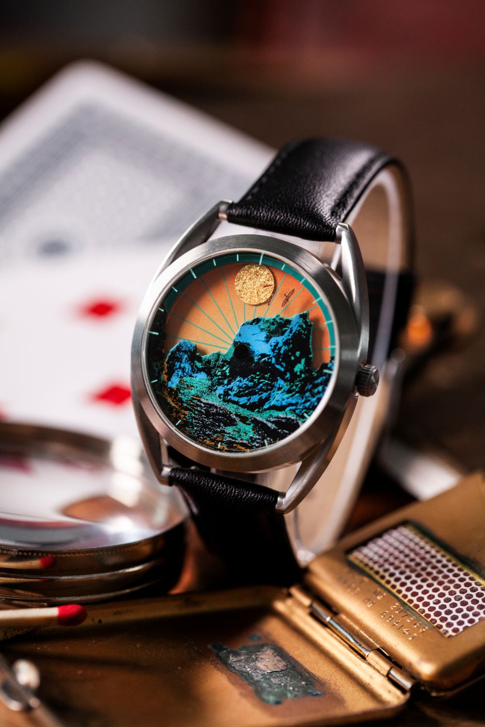 Each Silver Moon Over Cuillin Skye watch is a testament to the meticulous craftsmanship of Mr Jones Watches’ London workshop. Every colour in the design is hand-mixed, then airbrushed and printed layer by layer, before being carefully assembled. The delicate gilding of the sun and moon with precious metals adds an exquisite touch, elevating the watch to a miniature work of art.