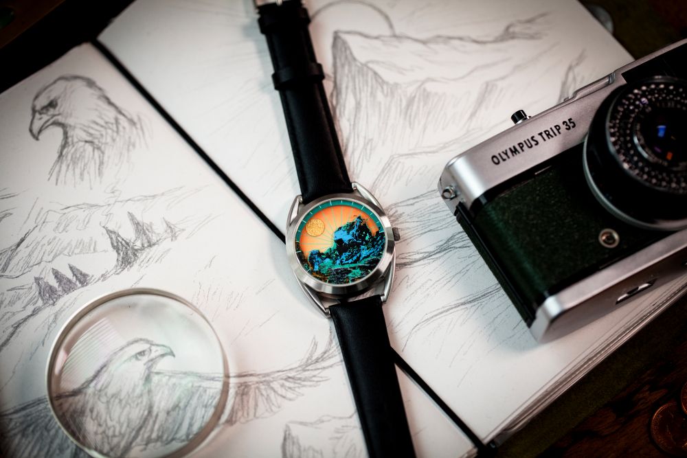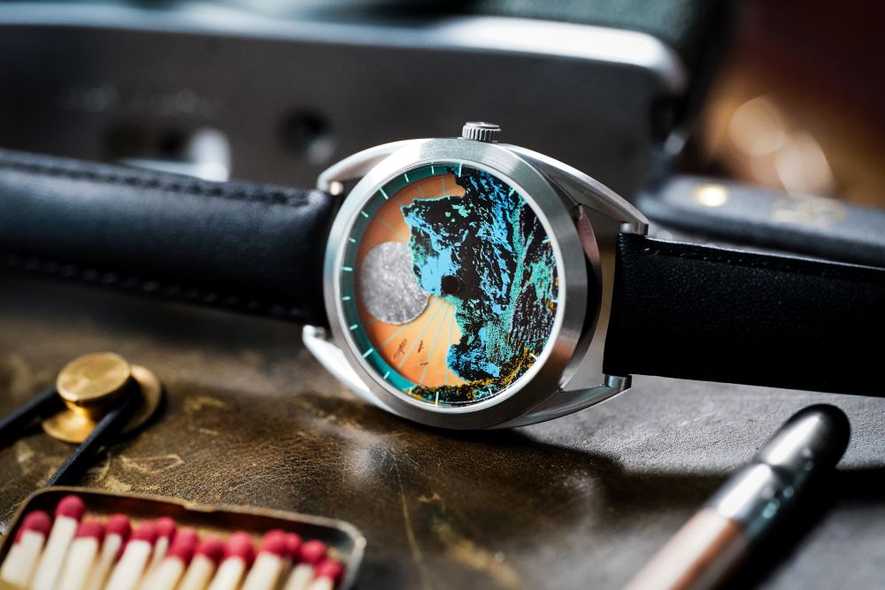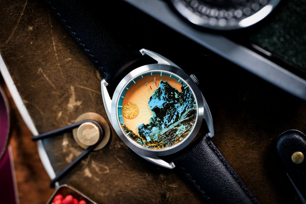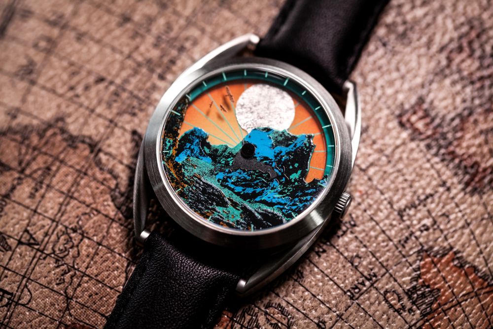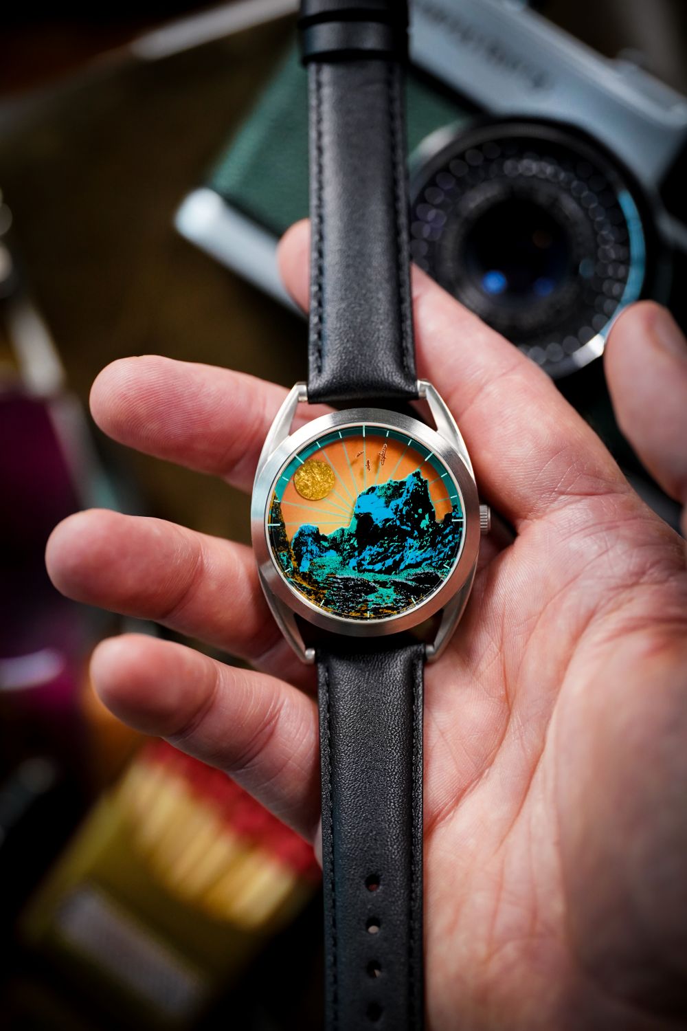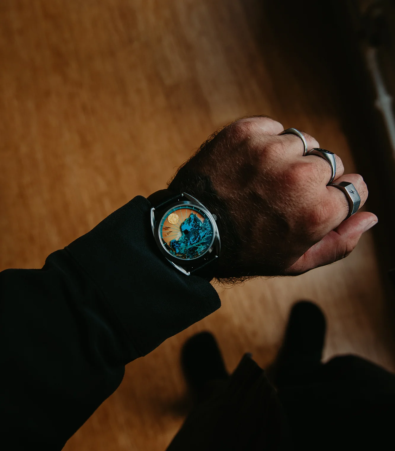 Each Silver Moon Over Cuillin Skye watch is a testament to the meticulous craftsmanship of Mr Jones Watches’ London workshop. Every colour in the design is hand-mixed, then airbrushed and printed layer by layer, before being carefully assembled. The delicate gilding of the sun and moon with precious metals adds an exquisite touch, elevating the watch to a miniature work of art.