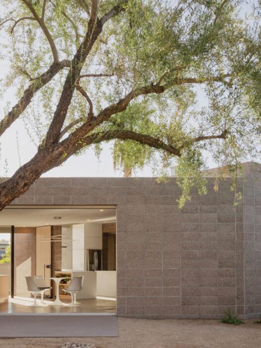 Step inside, and the home immediately opens up. The kitchen and living area are oriented to the primary courtyard, where a single olive tree creates a living sculpture and sends dappled shadows dancing across the floor.