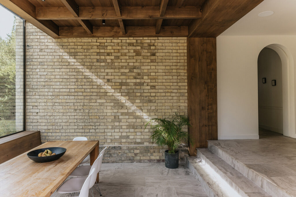To ensure the new build felt like a natural, organic evolution of the site, the studio heavily utilised exposed pale brickwork across the interior walls. This robust material is beautifully paired with a striking ceiling crafted from heavy, exposed oak beams.
