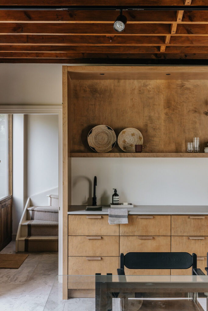 This deliberate material choice brilliantly ties the fresh, contemporary spaces in with both the traditional brickwork of the existing residential property and the heavy timber beams found in the neighbouring church hall.