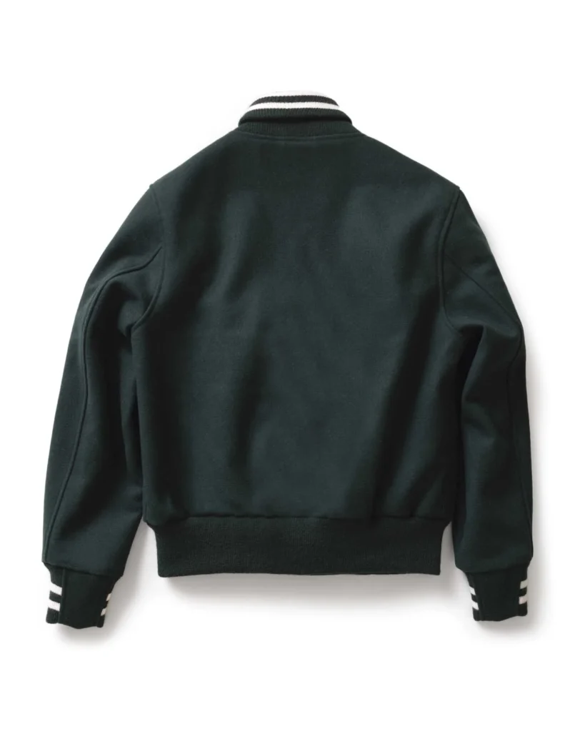 The aesthetic is finished with 45% wool and 55% acrylic double-stripe ribbing at the collar and cuffs, giving it that sporty, varsity-inspired silhouette that looks as good with a pair of selvedge denim as it does with tailored chinos. The snap closure adds to the retro charm, allowing for easy venting when you transition from the cold street to a warm bar.