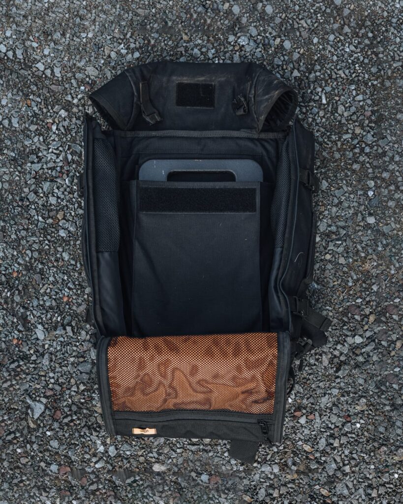 For the digital warrior, a dedicated, padded side-access compartment secures laptops up to 16″, while smart internal organisation—including high-visibility orange nylon-backed mesh pockets—ensures your EDC like keys, wallet, and passport are easily located.
