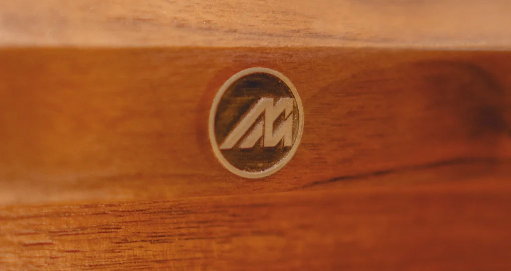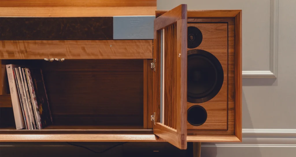 The first impression is one of sheer elegance and meticulous craftsmanship. The shell is crafted from premium figured walnut, with striking vertical slat louvred doors that conceal the speakers behind a custom silver-gold fabric. The Creator Edition details are what truly set it apart: a numbered brass plaque (1−55) affirms its exclusivity, while a brass coin bearing Manny’s personal monogram is embedded in the stow-away lid.