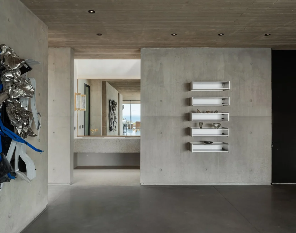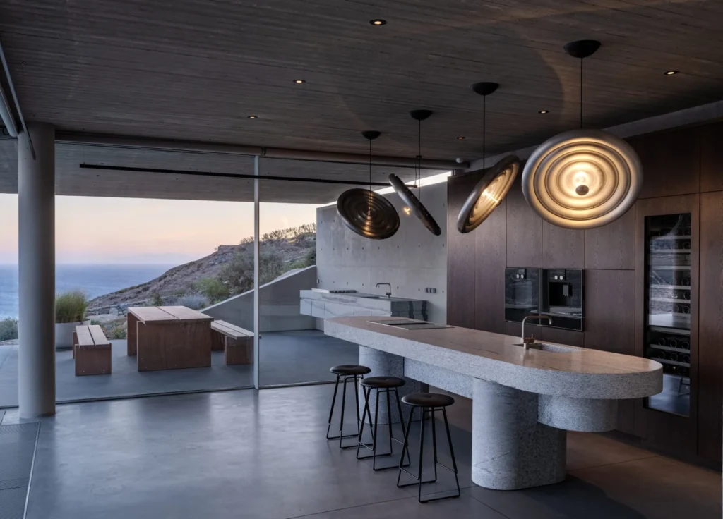 Tom Dixon’s touch is ever-present throughout the villa’s interiors, which balance organic warmth with raw elegance. The curved granite kitchen island is a centrepiece, echoing the residence’s seamless blend of hard and soft elements. Curved finishes are also found in the built-in showers and the extended roof that curves gently over the terrace, providing shade and softness to the otherwise rugged aesthetic.
