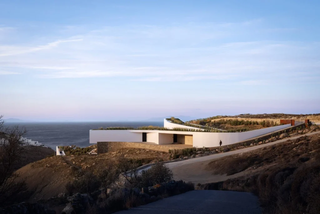 Nestled in the Elia region, Aimasia Residence makes a statement by blending seamlessly into the landscape, thanks in no small part to an existing 62-metre-long granite wall that serves as the “spine” of the home. This ancient wall not only anchors the villa to its place but also informs the overall design language—a symbiosis of raw materiality and refined living. Topped with a curving green roof that seems to grow organically from the hill itself, the villa deliberately defies the typical white boxy silhouettes that dominate Mykonos, instead opting for something more thoughtful, more profound.
