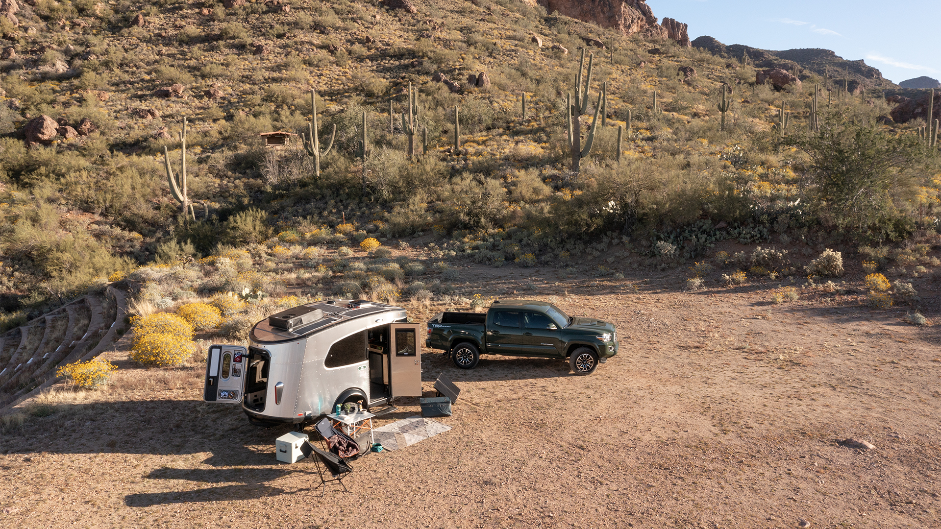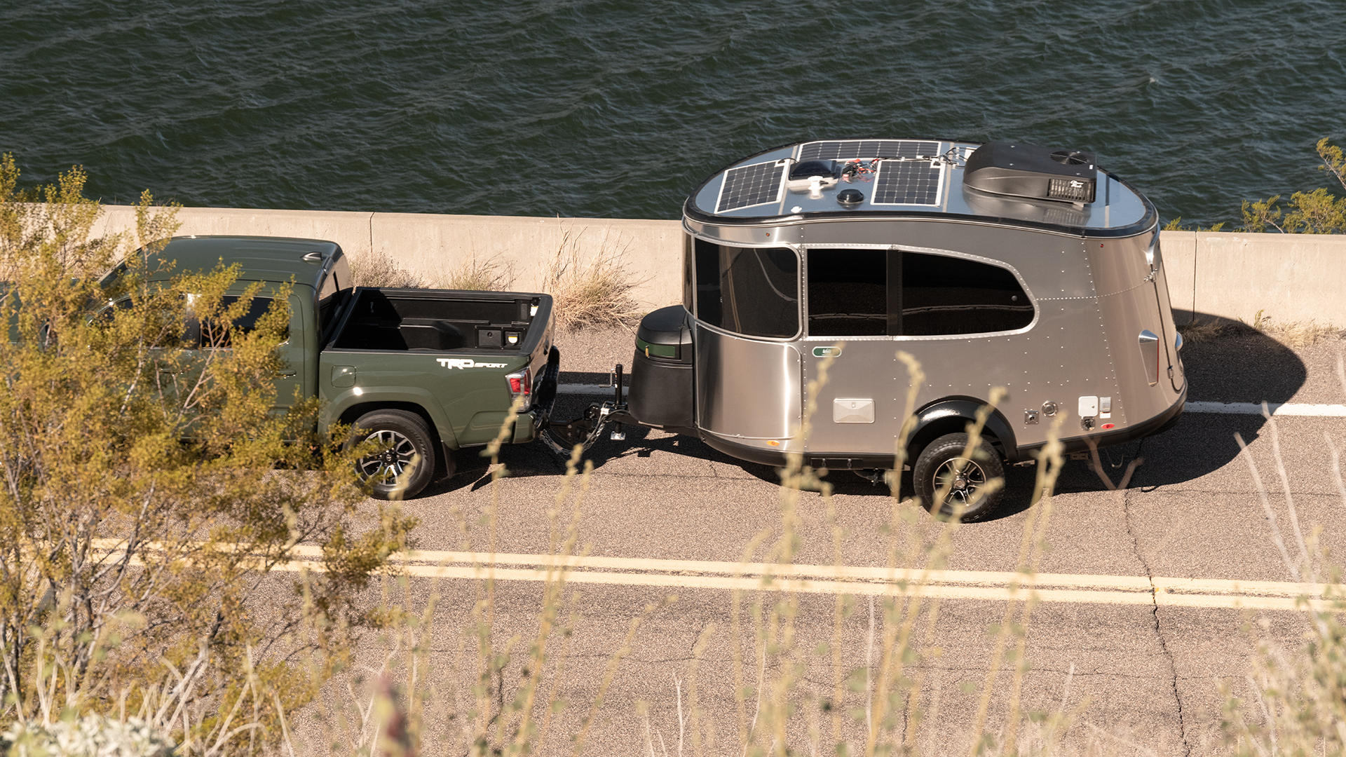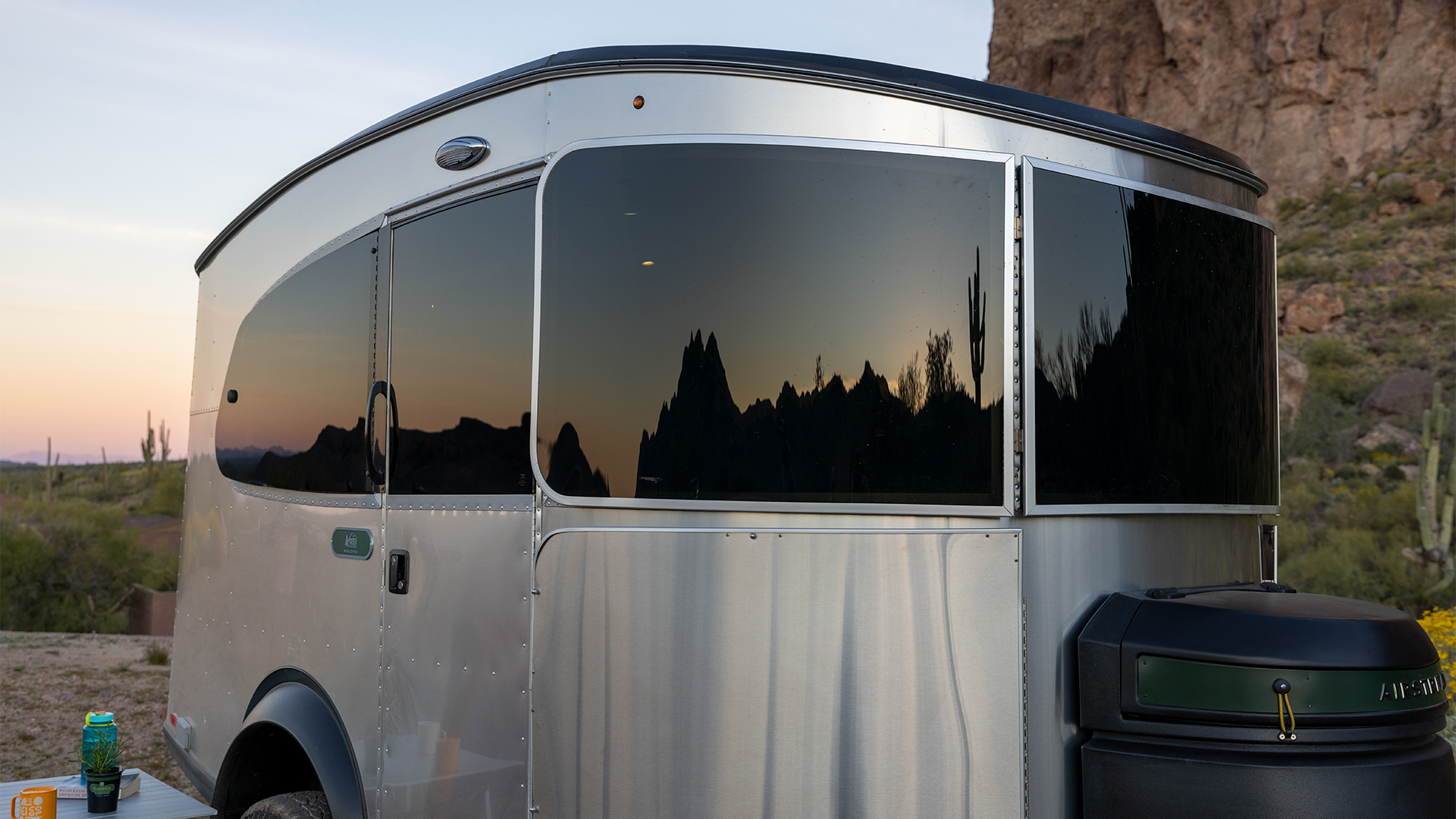 The compact, lightweight exterior design of the Airstream x REI 2023 Special Edition Camper makes this small Airstream especially easy (not to mention fun) to tow. It’s towable with a variety of mid-size SUVs, which means you don’t have to make any big changes before you head out for a life-changing adventure. In addition, the big departure angle and off-road tires help you take on more paths with confidence, and rock guards and fender flares help prevent damage from gravel and debris.