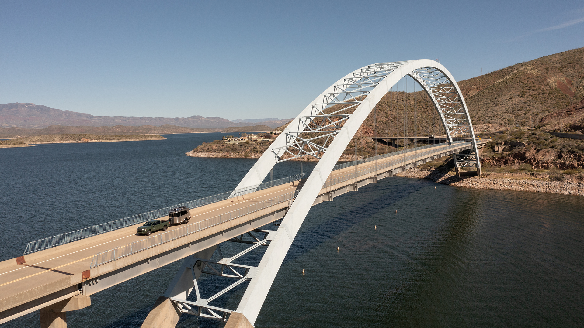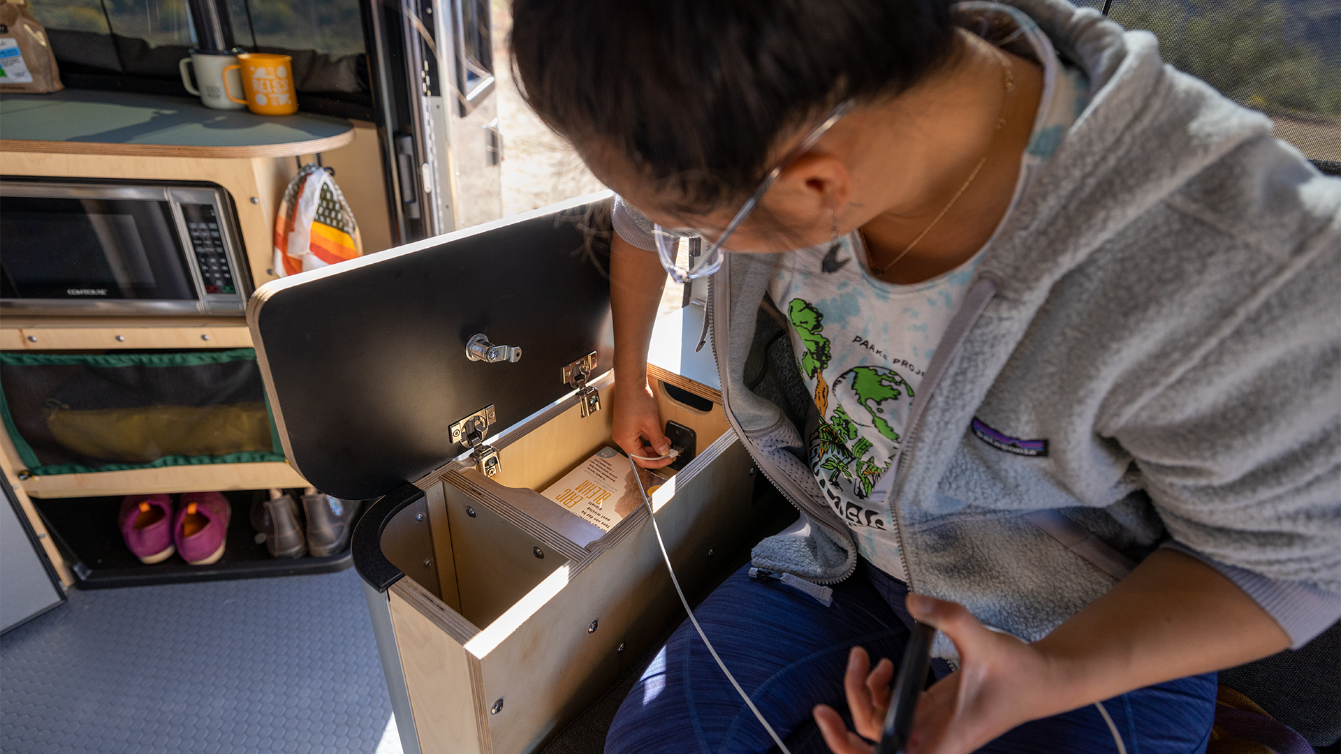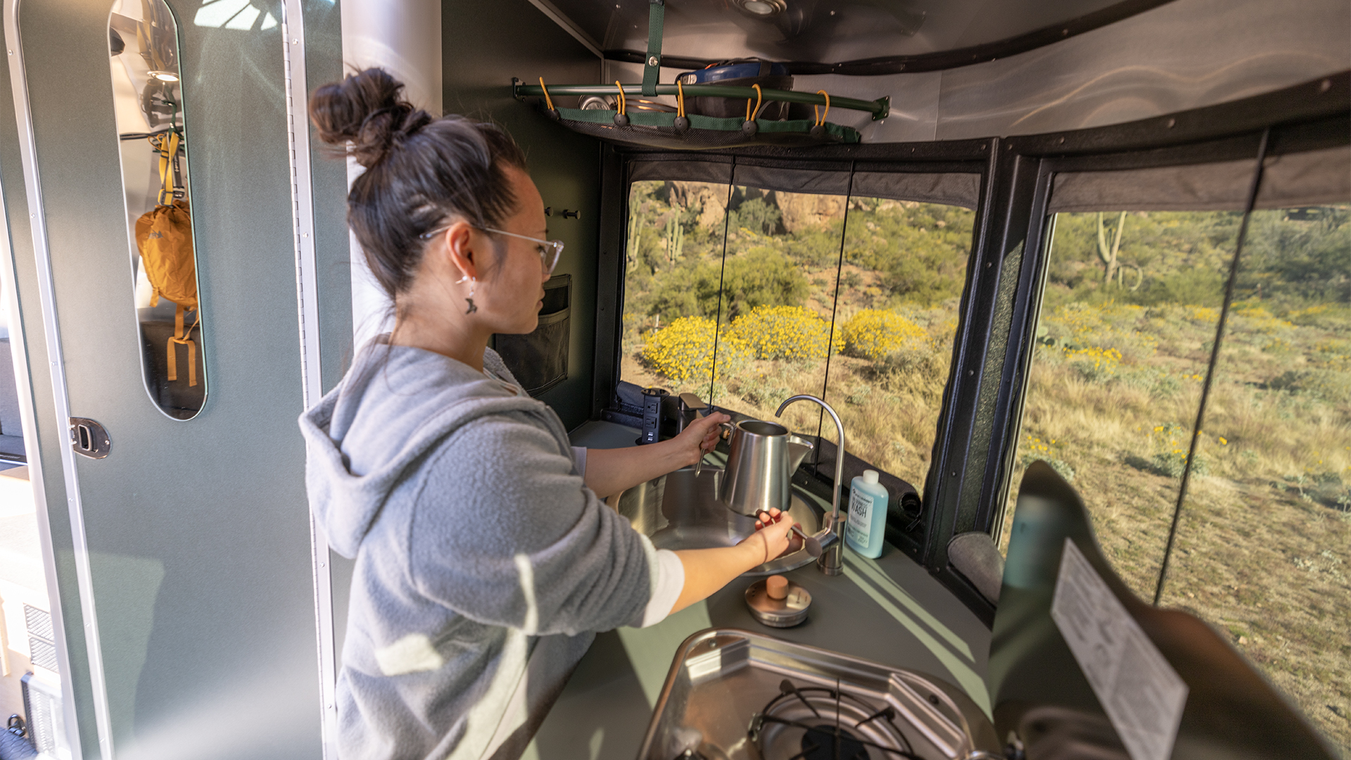 The compact, lightweight exterior design of the Airstream x REI 2023 Special Edition Camper makes this small Airstream especially easy (not to mention fun) to tow. It’s towable with a variety of mid-size SUVs, which means you don’t have to make any big changes before you head out for a life-changing adventure. In addition, the big departure angle and off-road tires help you take on more paths with confidence, and rock guards and fender flares help prevent damage from gravel and debris.