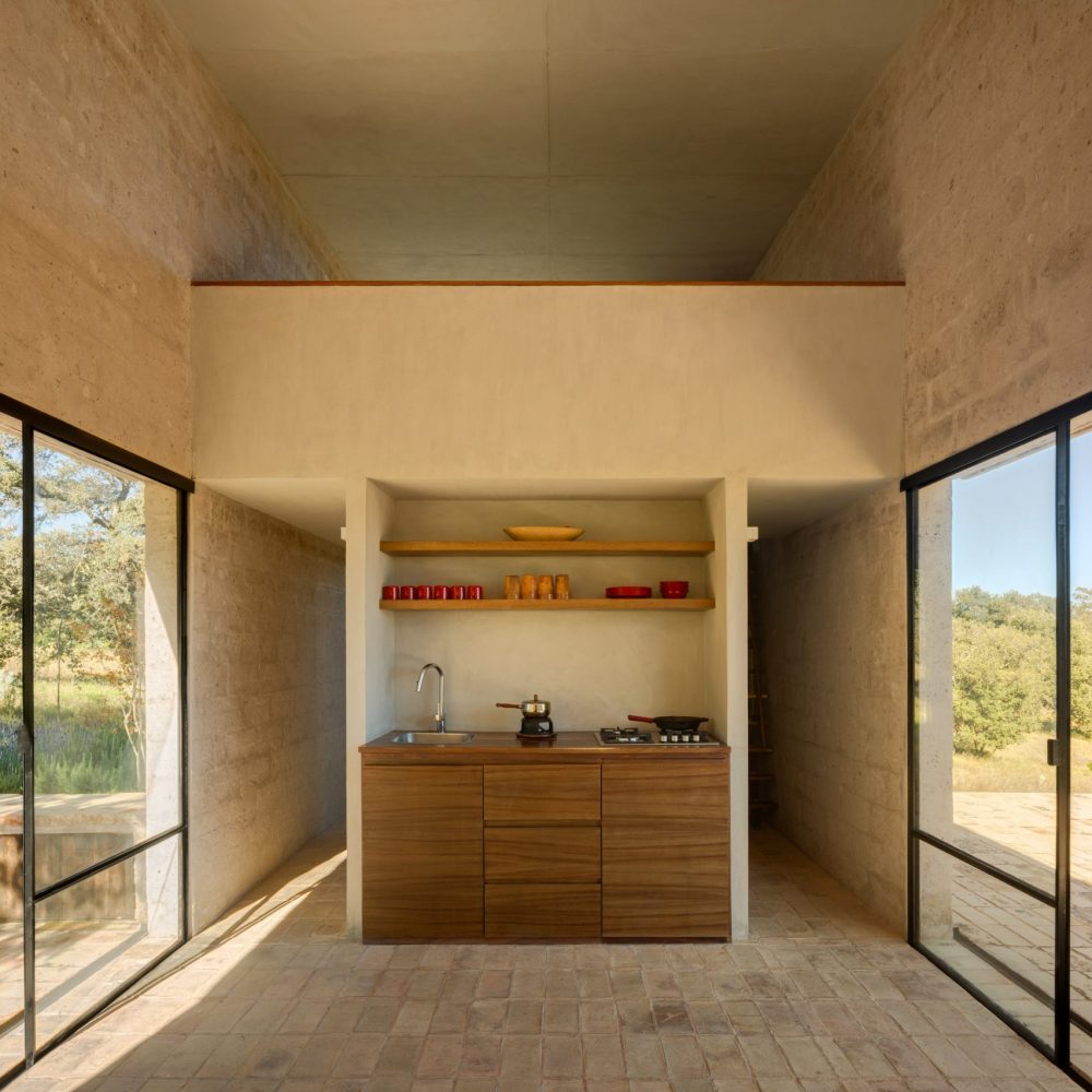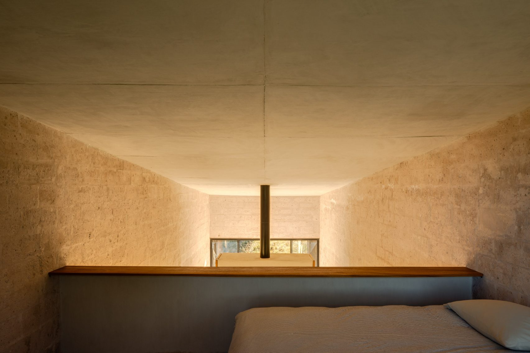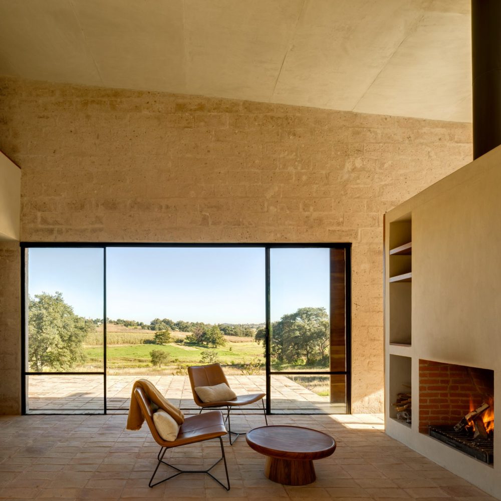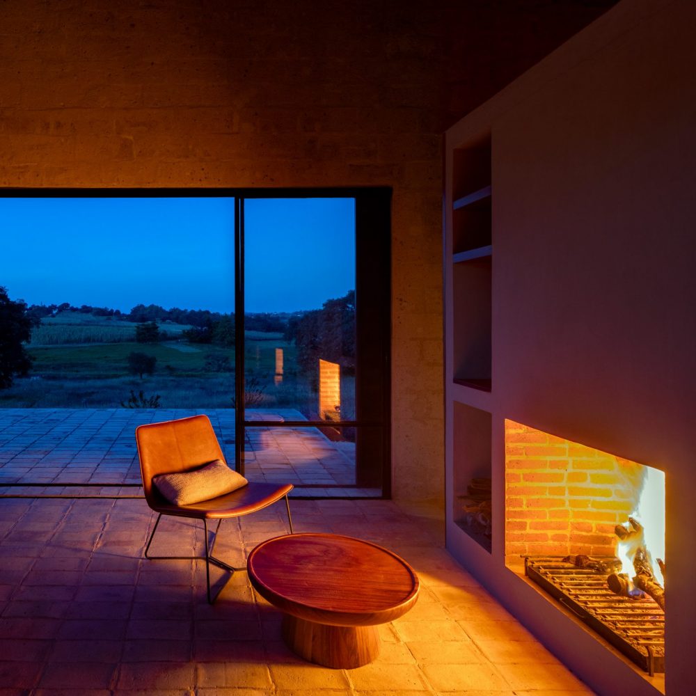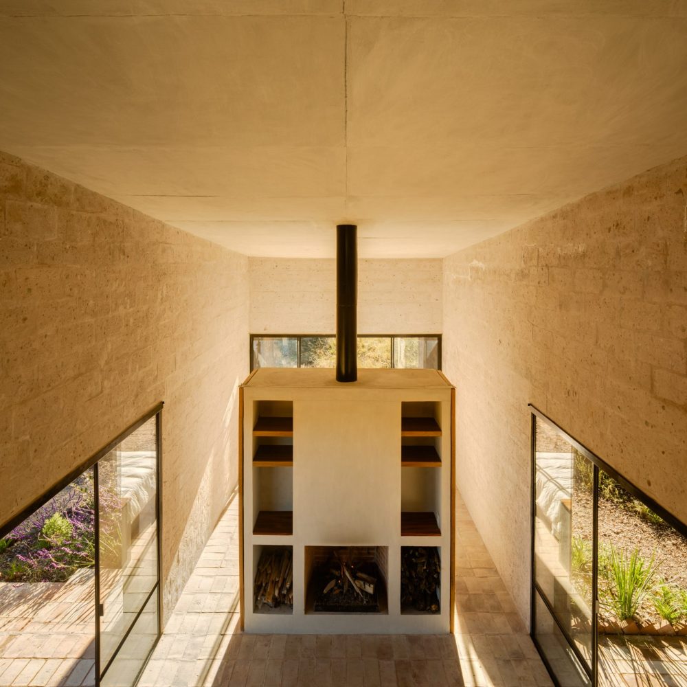 The main living space of Alculco Residence has a rectangular floor plan and the area is bordered on one side by a small built-in kitchenette for preparing simple meals, and on the other by a fireplace with some armchairs in front of it. It doesn’t get much simpler than this but there is something deeply refreshing about the minimalistic nature of this wonderful piece of architecture from PPAA Arquitectos.