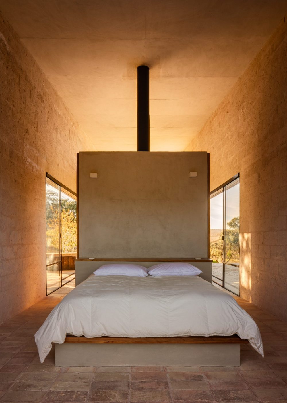 On the inside, the architects chose to use clay for the building’s floors, and local lumber for other elements of the internal build. They left every material in its raw state without covering it and this gives the home a real earthy feel that makes you feel at one with the nature that surrounds it. The property has an extremely simple layout complete free from clutter which is intended to maximise views to the landscape that can be found surrounding the Alculco Residence.