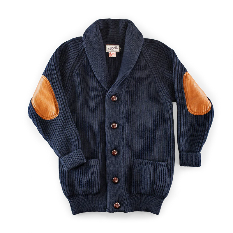 The Cardigan features a ribbed collar, cuff, and hem, as well as the classic 5 leather buttons on the front. This is comfort, warmth, and style in one garment.