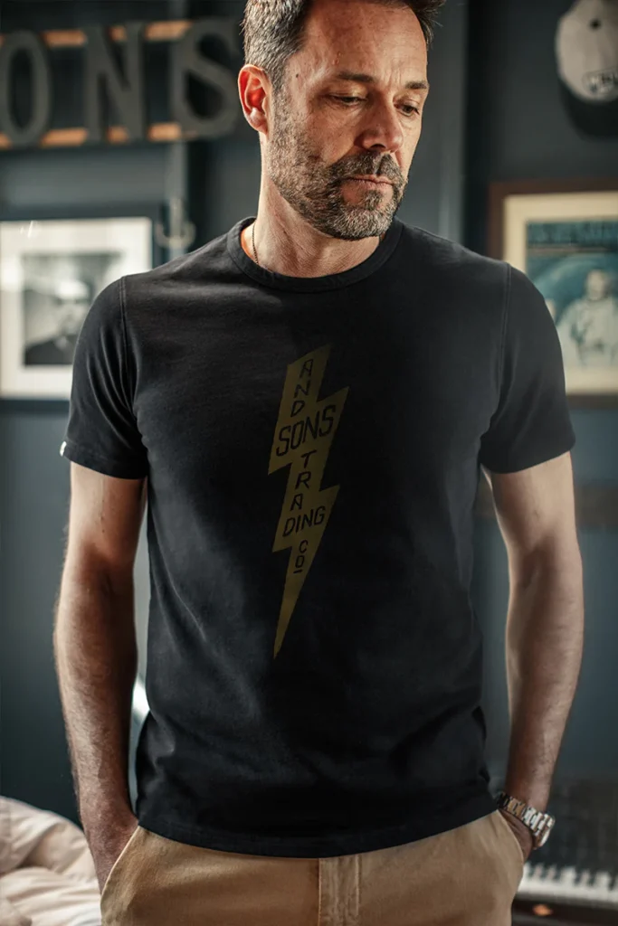 The Lightning Bolt T-Shirt is a unique and stylish piece that showcases &SONS dedication to quality and craftsmanship. Each tee is lovingly designed and printed in their studio, making sure of a truly one-of-a-kind product. The ace design inked onto the chest is a work of art that represents the essence of &SONS.