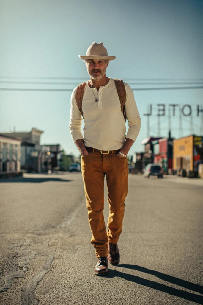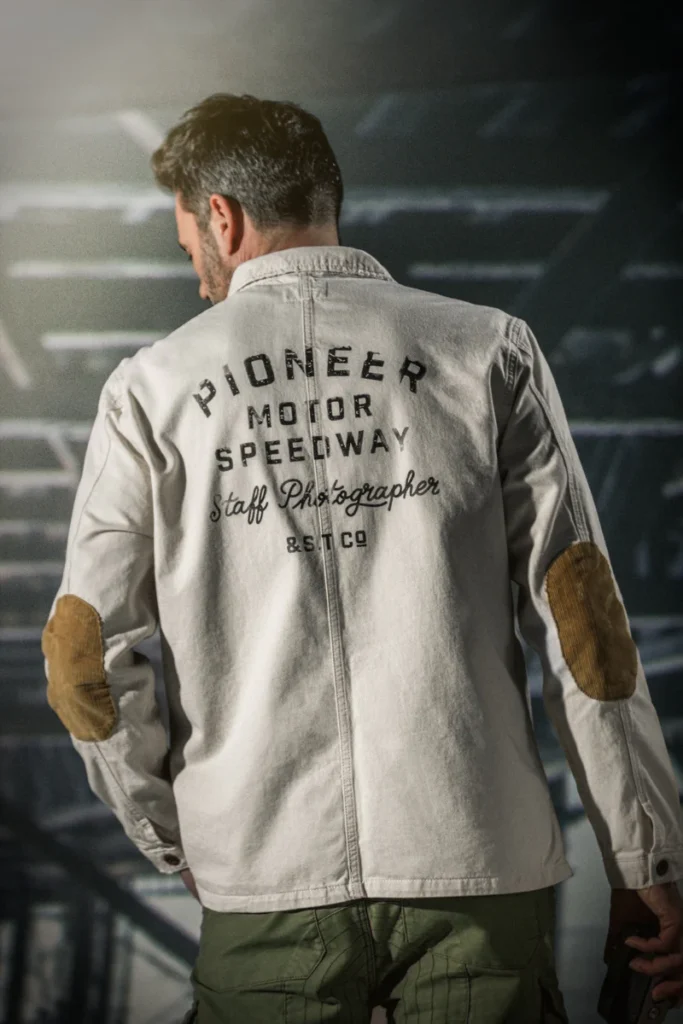 The Ecru Carver is a jacket that has been hand-finished to give it a worn-in, vintage look. The occasional scuffs and marks add to the jacket’s rugged aesthetic, which is reminiscent of the original railroad pieces. The jacket is finished with light corduroy elbow patches and corozo buttons, which provide contrast to the natural ecru color.