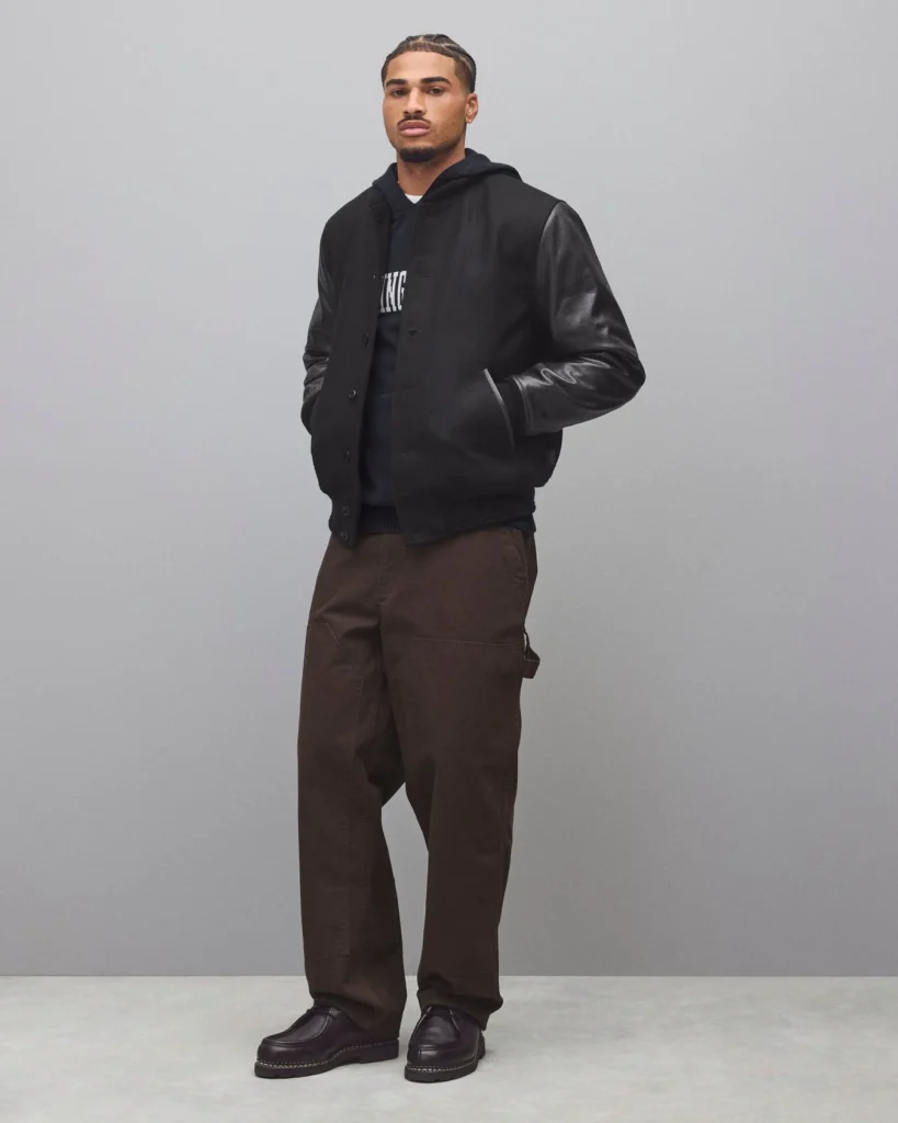 This varsity jacket is built with a combination of Italian wool cashmere and genuine leather. Featuring a generous standard fit for versatile layering, with viscose-lined sleeves and body.