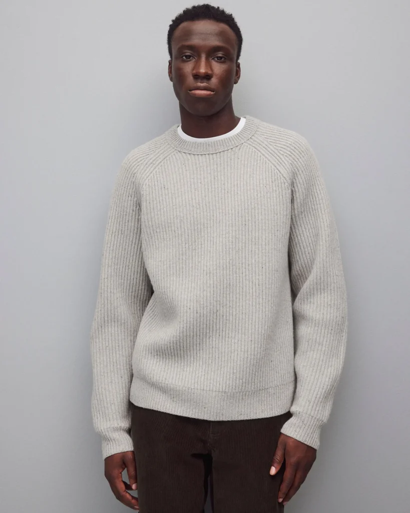 This knitted crewneck is crafted from nep merino wool, featuring small knots or clusters to impart distinctive character and feel. Constructed in a standard fit, with fully fashioned seams. Designed with a rib knit collar, raglan sleeves, side gussets, and rib knit cuffs and hem.