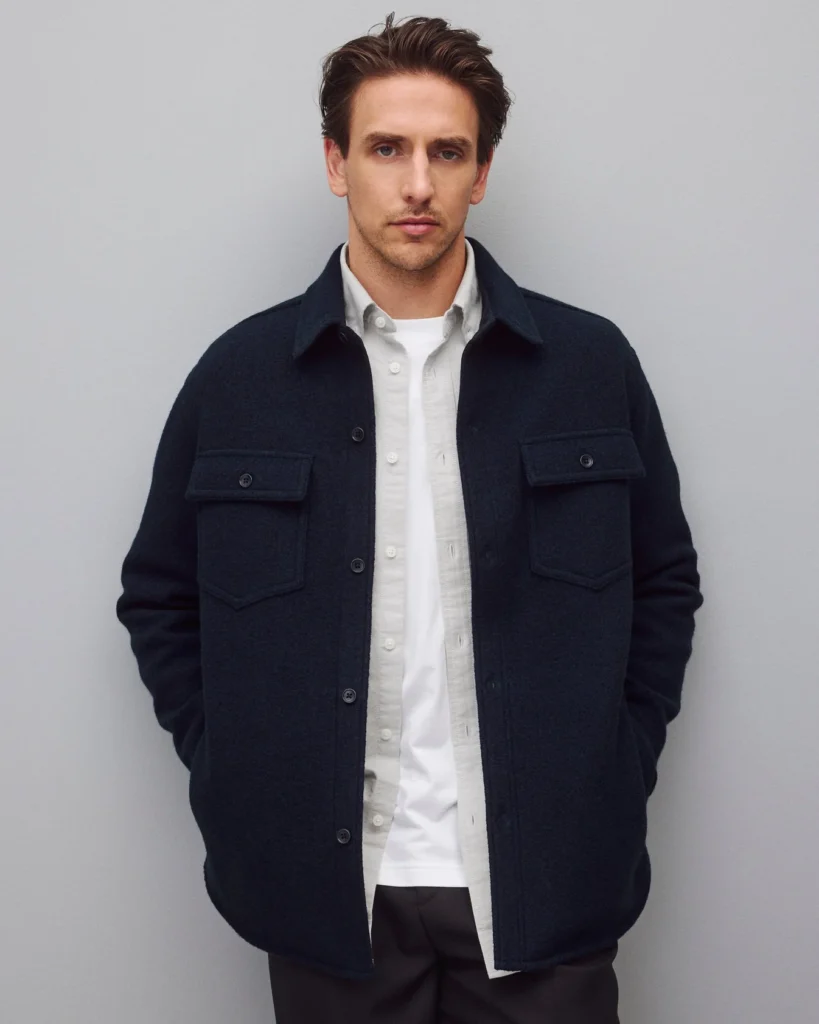 This classic overshirt is crafted from boiled merino wool with a dense, hairy texture. Featuring a standard fit, with full-cut sleeves and torso to provide versatility for layering.