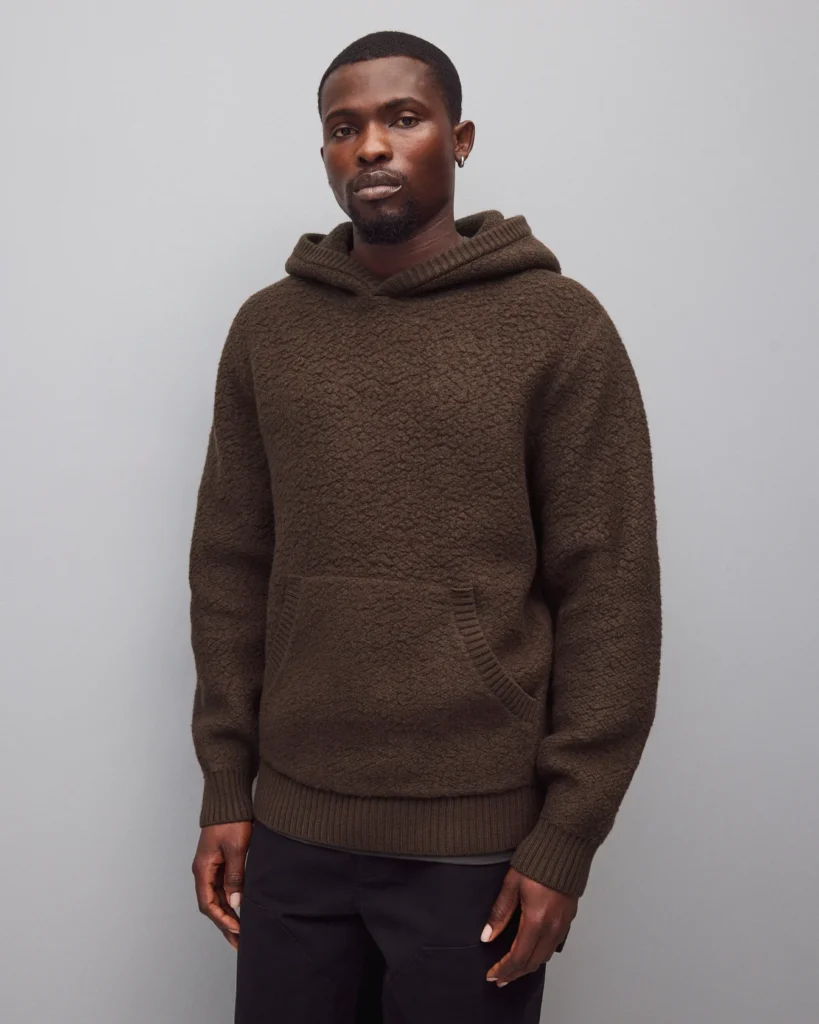 This winter-weight hoodie is knit from a merino-cotton blend with a curly, boucle-textured feel. Featuring a standard fit, with full-cut sleeves and torso to provide versatility for layering.