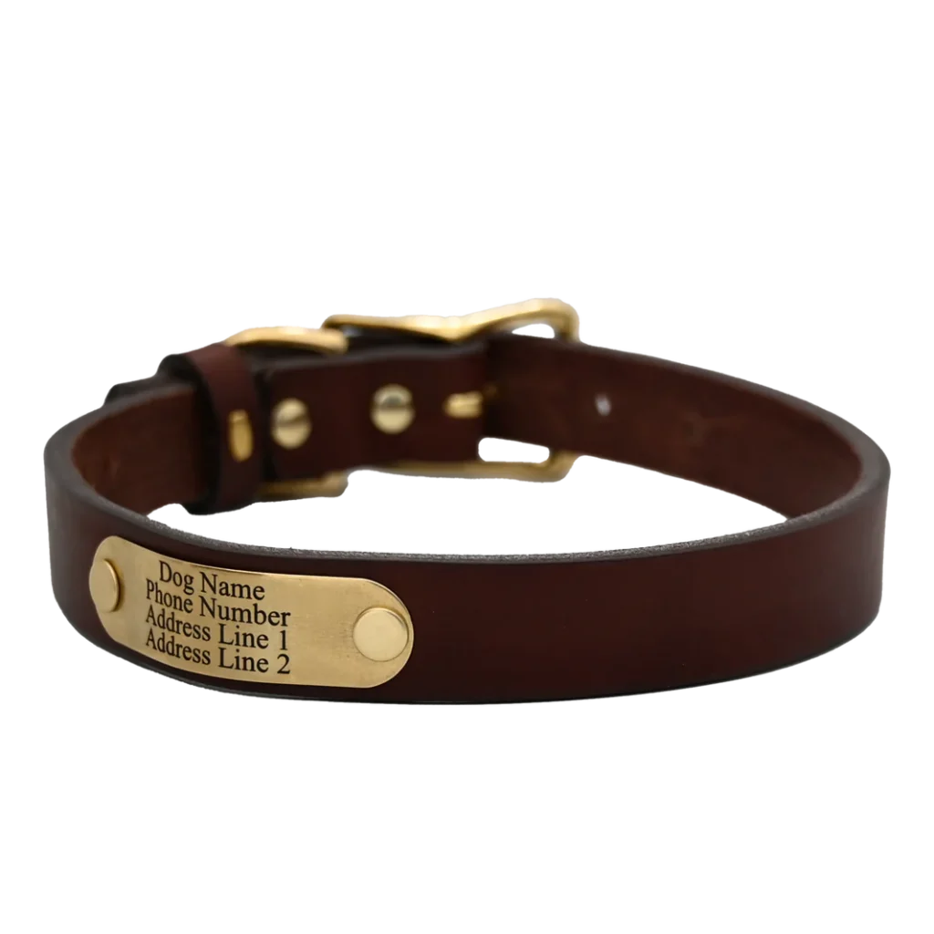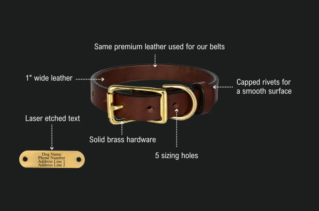 These top-class Personalized Dog Collars from American Bench Craft are available in two different leather colours – Brown and Black – and your choice of buckle hardware from Nickel and Brass. Designed for comfort, safety, and style during every adventure, these Personalized Dog Collars are crafted from the same 1/8” thick leather used in the much-lauded American Bench Craft belts. Featuring solid brass hardware that resists rust, this collar combines durability with a fashionable look for your pet.