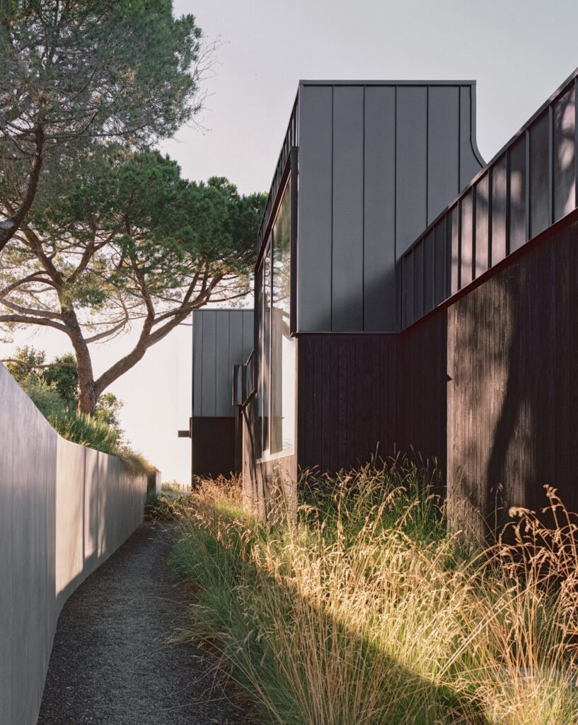 The exterior is clad in a moody, sophisticated palette of blackened wood and dark metal, allowing it to sit harmoniously within its rugged landscape.