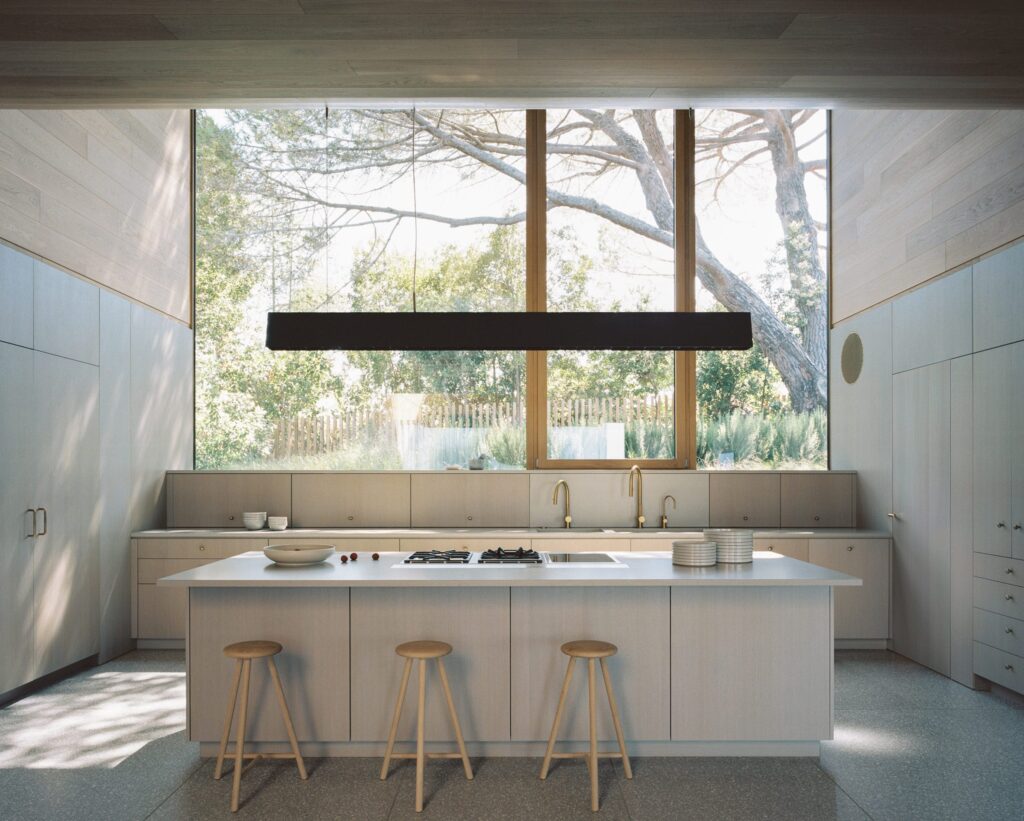 The thoughtful design continues outside, where the landscaping is intended to cultivate a meadow-like appearance using layers of native California grasses, perennials, and majestic live oaks, further cementing the House of Horns’ profound connection to its spectacular setting.