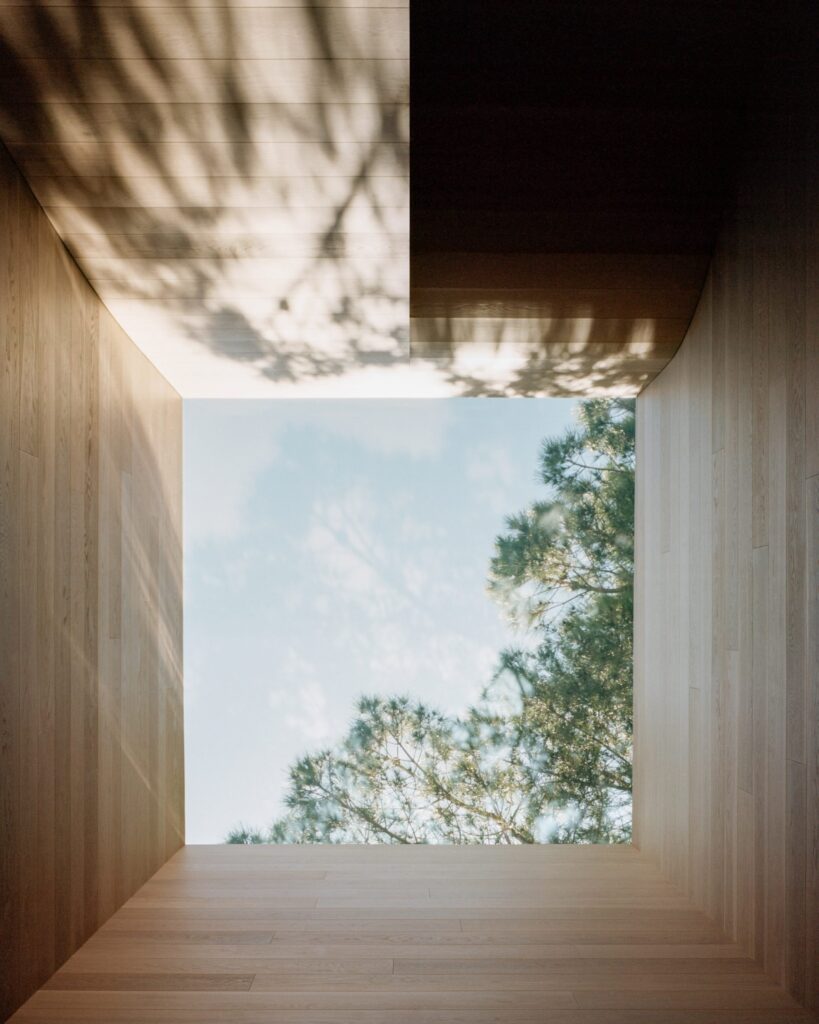 In stark contrast to the bright, airy volume above, the concrete lower level offers a more intimate and grounded experience. It is laid out as a series of cosy compartments or chambers, wrapped in wood, that open out onto partially enclosed gravel courtyards, blurring the line between inside and out.