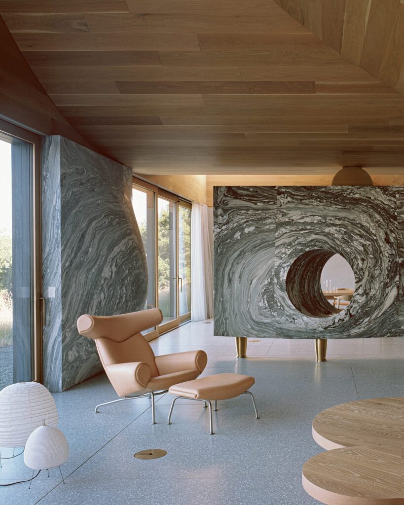 This luxurious material palette extends into the primary suite, where an ovoid bathtub rendered in the same blue-grey marble offers a serene sanctuary.