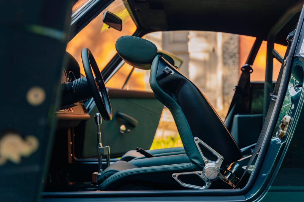 The interior dares to match, with gorgeous green leather upholstery covering not just the seats but extending to a full, leather-wrapped roll cage—a perfect example of its race-car-meets-gentleman ethos.