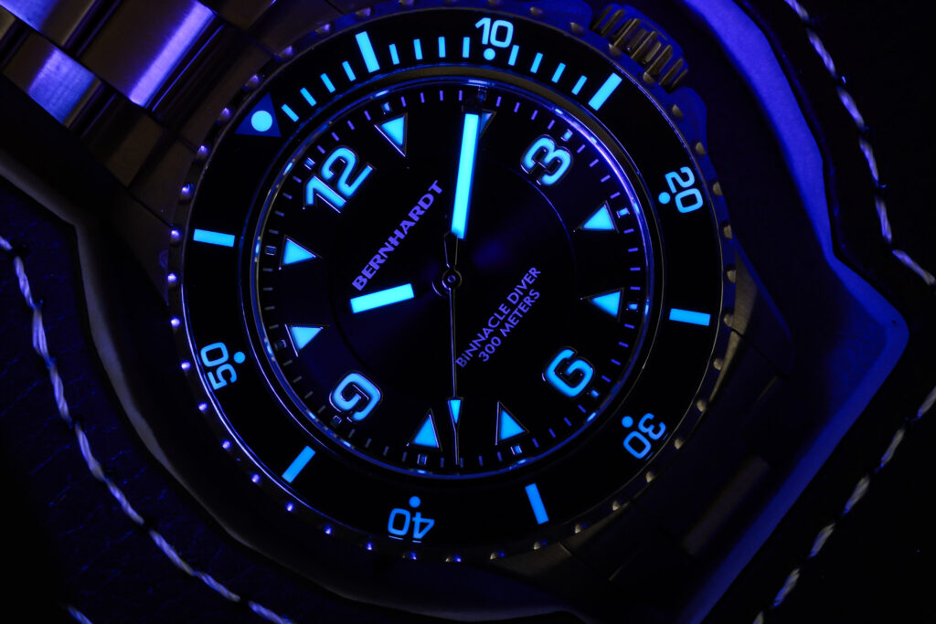 For the first time, the Binnacle Diver features a sandwich dial, adding a stunning depth and dimension to its face. The cut-out indices reveal a thick base layer of Grade A Super-LumiNova BGW9, which explodes with an intense, long-lasting blue glow in low light.
